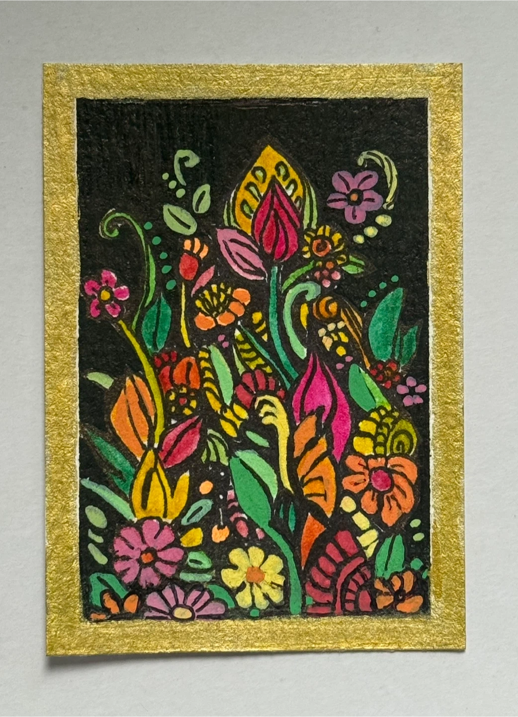 A vibrant composition of a colourful array of flowers on a black background with a gold border. It comes in a protective penny sleeve. It can be displayed in a mini frame; make a perfect thoughtful one-of-a-kind little gift to your favourite plant lover.