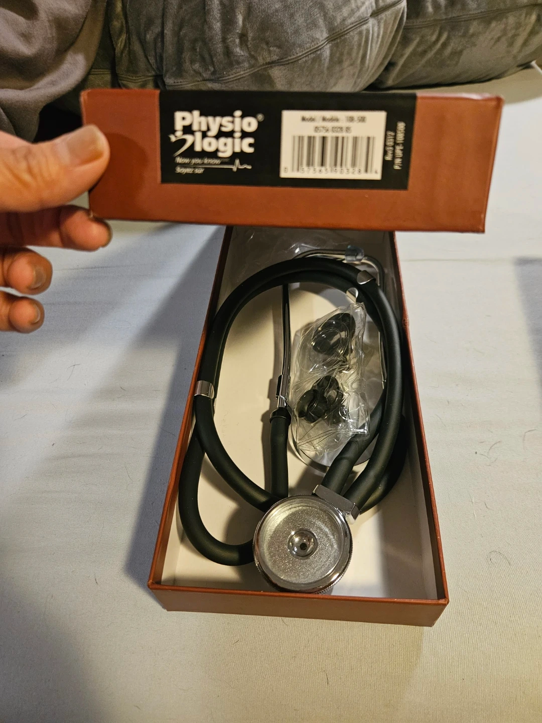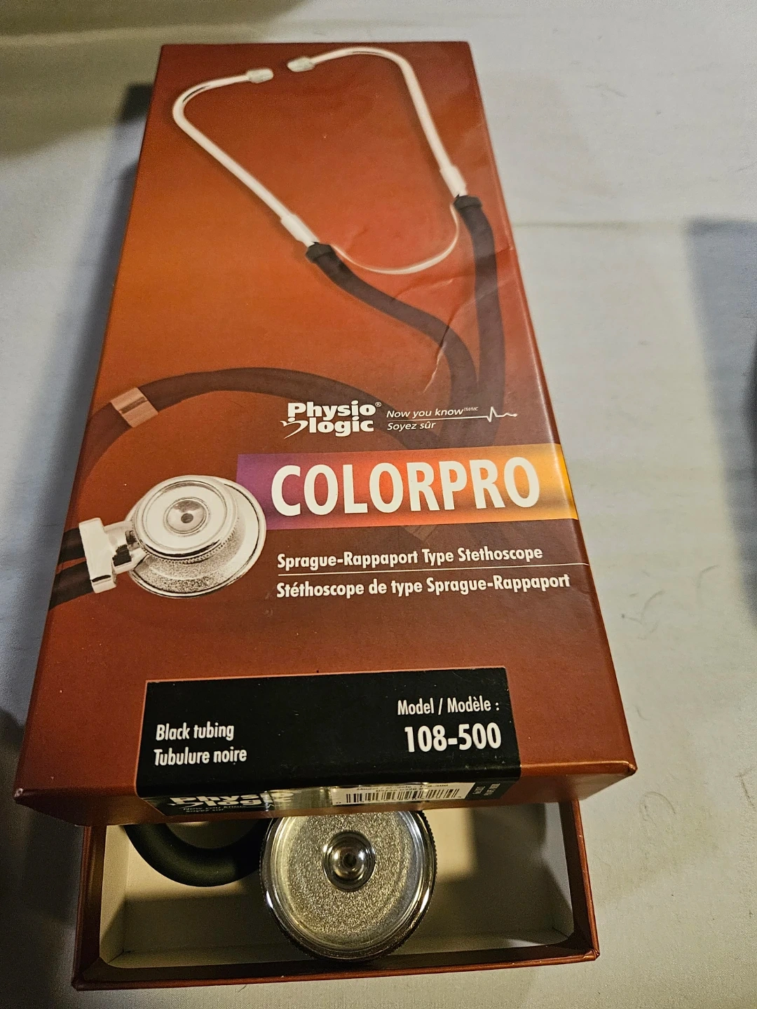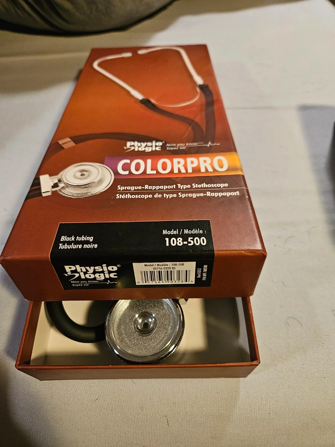 This is a Physio Logic Colorpro Sprague-Rappaport type stethoscope. It features black tubing and comes in its original box. Includes extra ear tips.