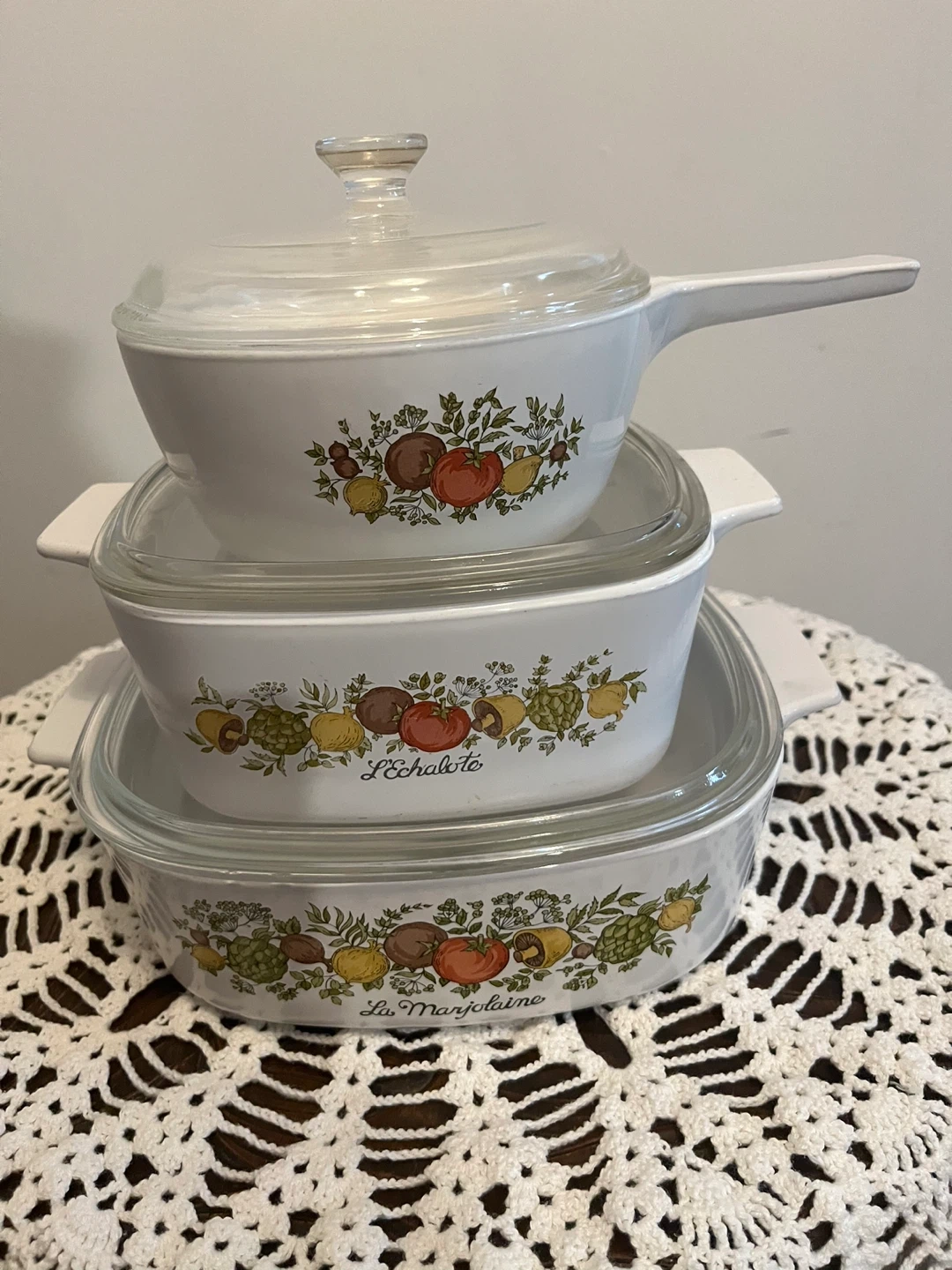 This is a set of three CorningWare casserole dishes featuring the La Marjolaine and L'Echalote patterns. They come with clear glass lids. These dishes are perfect for everyday cooking and serving! 2L,1.5Land 750 ml