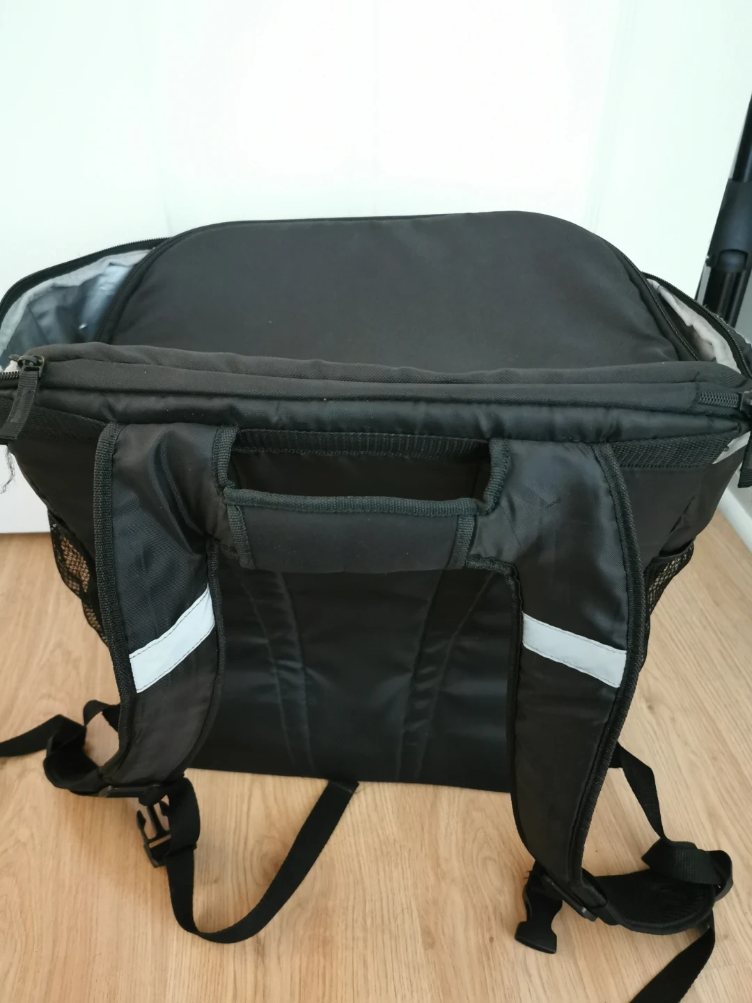 This black insulated delivery backpack is designed for durability and ease of transport. It features a spacious main compartment and side mesh pockets. The reflective strips enhance visibility in low light conditions.