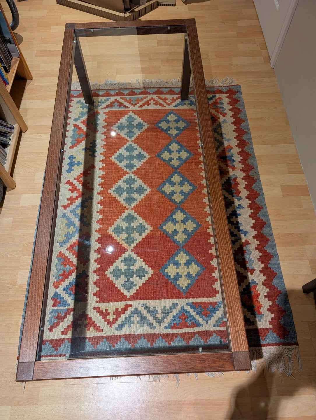 Selling an IKEA coffee table with a glass top and a sturdy wooden frame. It's in good condition