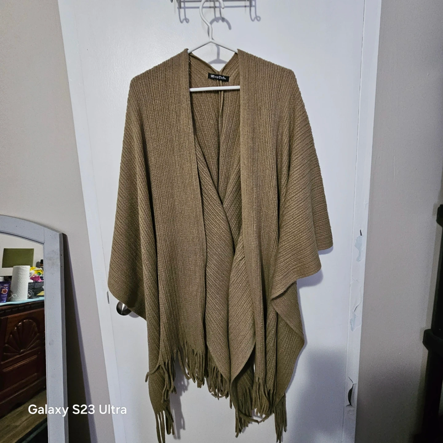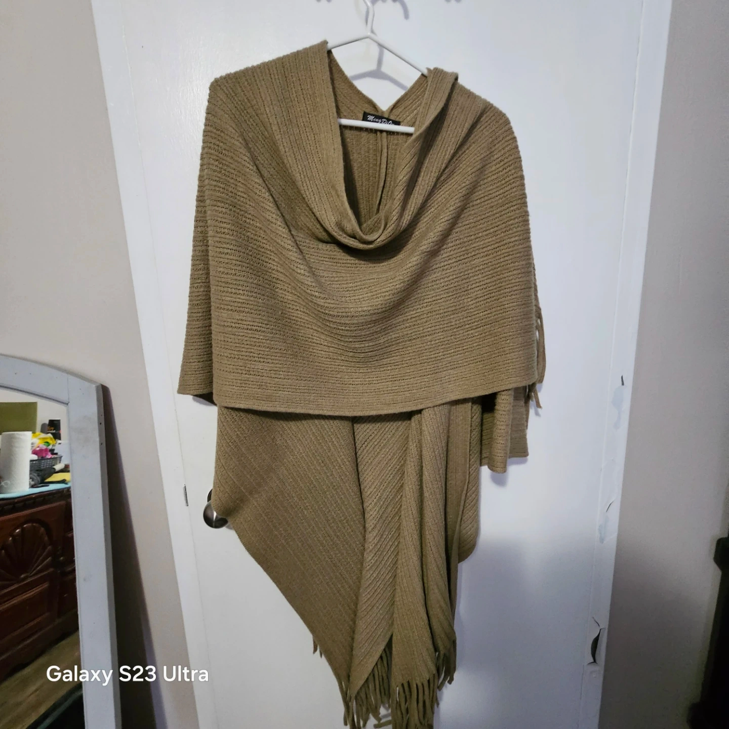 A cozy knit poncho scarf in a versatile tan colour. It features a stylish cowl neck and is finished with a lovely fringe. This piece adds warmth and a touch of elegance to any outfit!