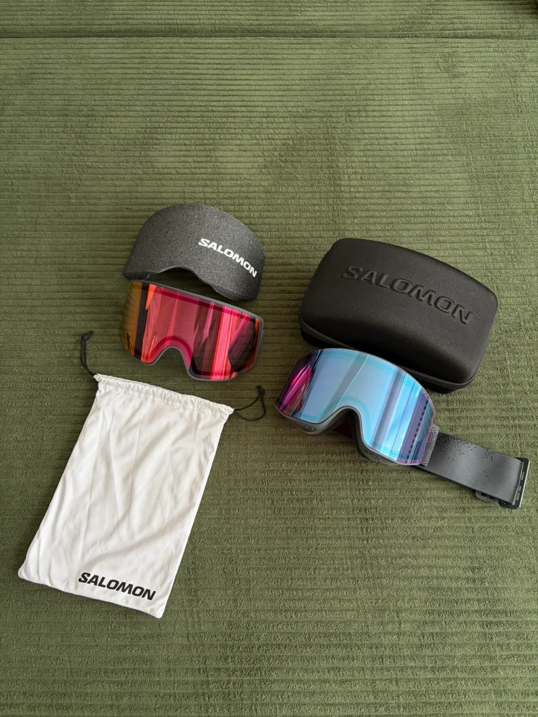 Salomon ski goggles with two lenses. Retails for $300. Includes a hard case and a soft drawstring bag for storage. Has one small scratch on the goggles but it is barely noticeable, I have never worn them and they are brand new and came slightly damaged, message me with any other questions.