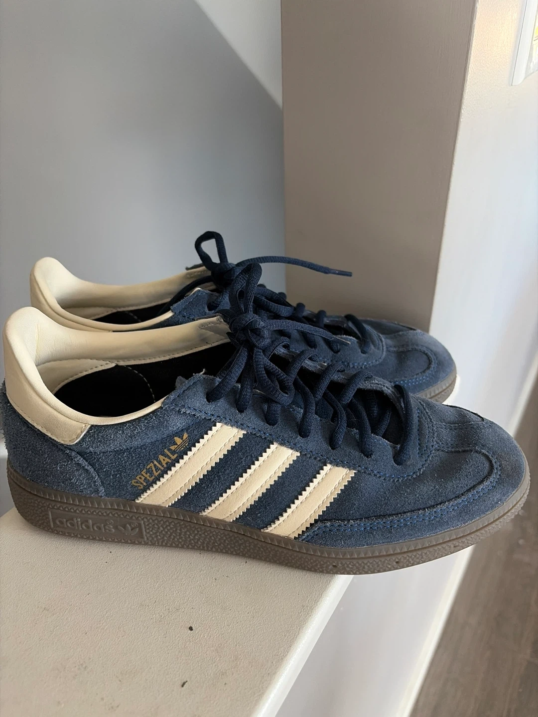 These are Adidas Spezial sneakers in a dark blue suede. They feature the classic three-stripe design and a comfortable fit. Good for everyday casual wear.
