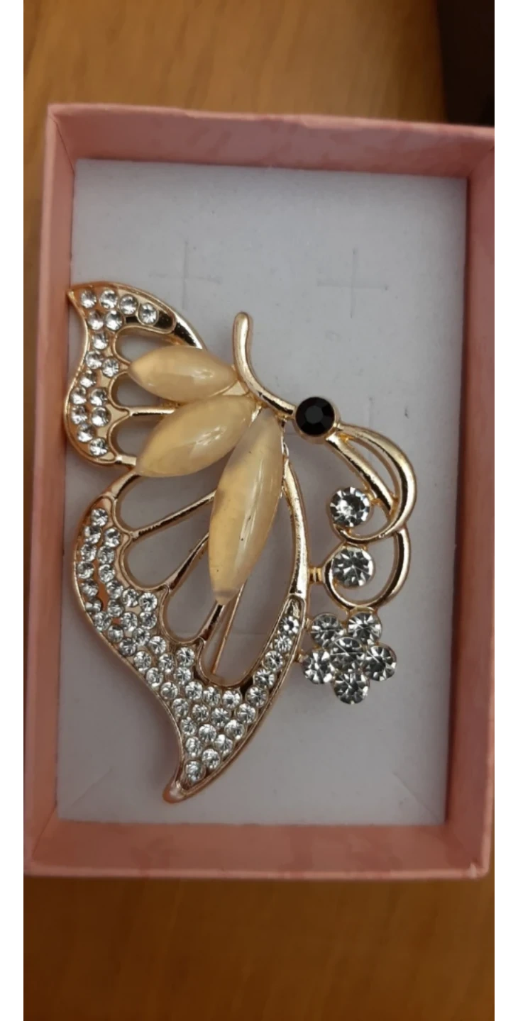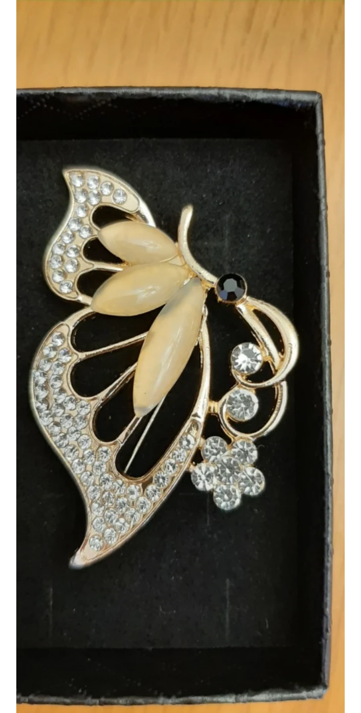 Lovely gold-tone brooch shaped like a butterfly. It's adorned with clear rhinestones and has creamy, oval-shaped stones on the wings.