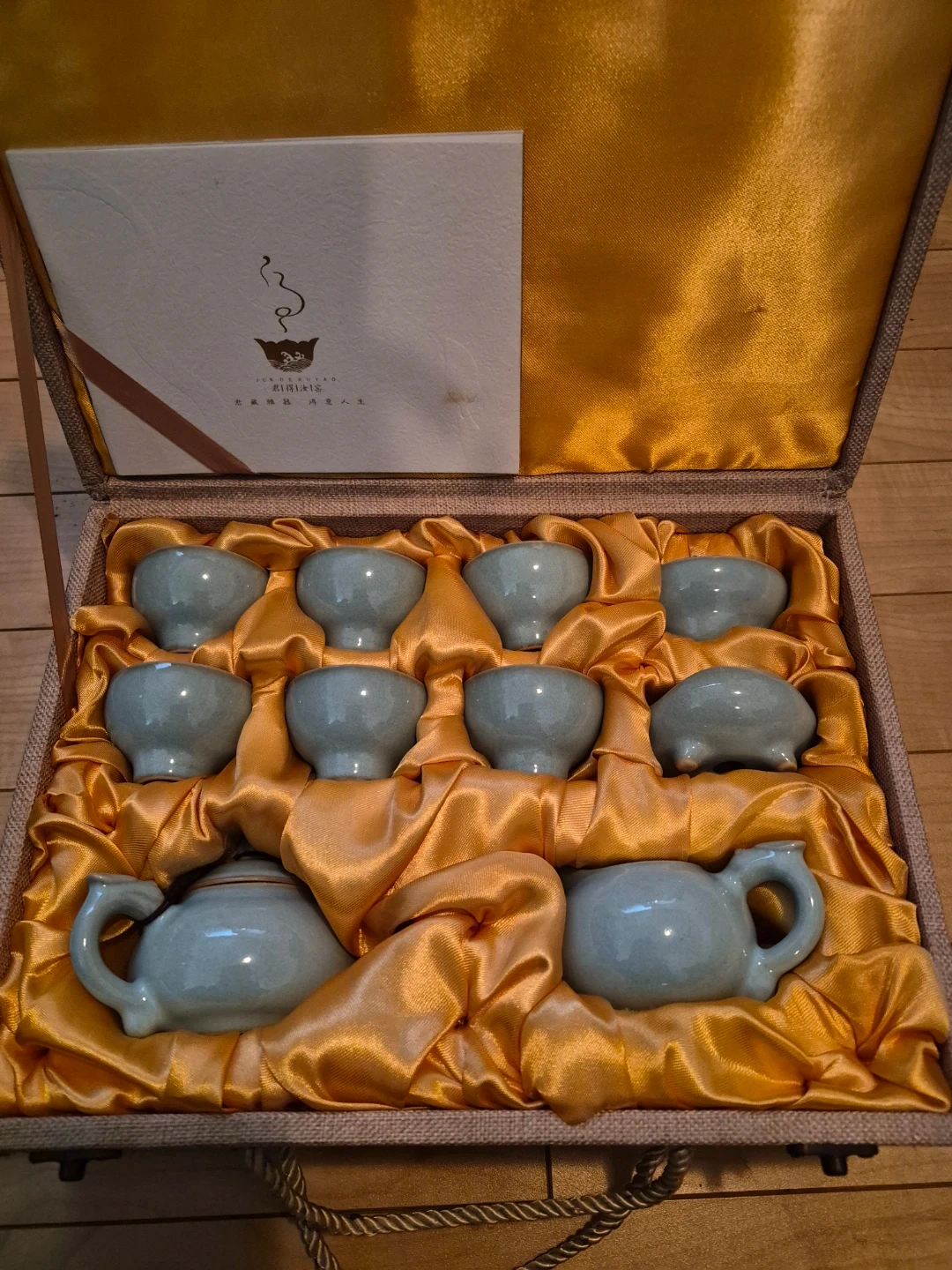 This tea set includes two teapots and eight small cups, all made of light blue ceramic. It comes presented in a fabric-covered case with a golden satin lining. The set is perfect for serving tea to a small group.