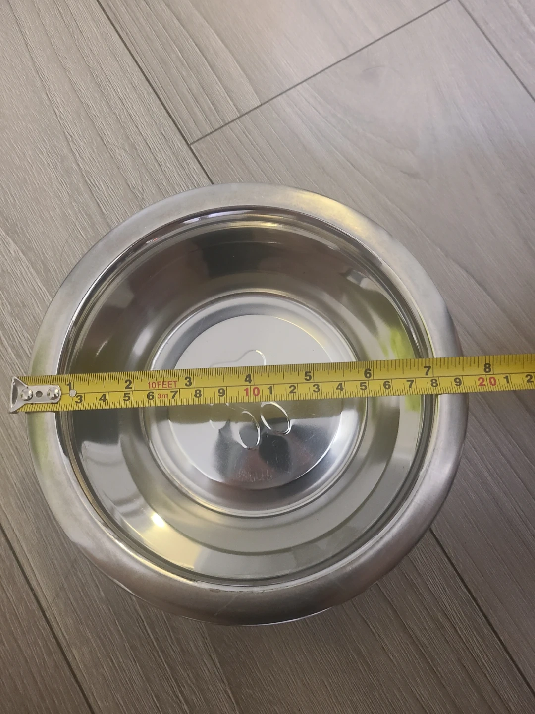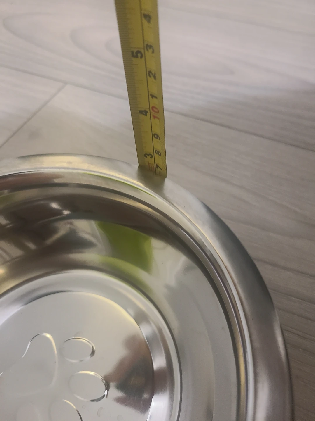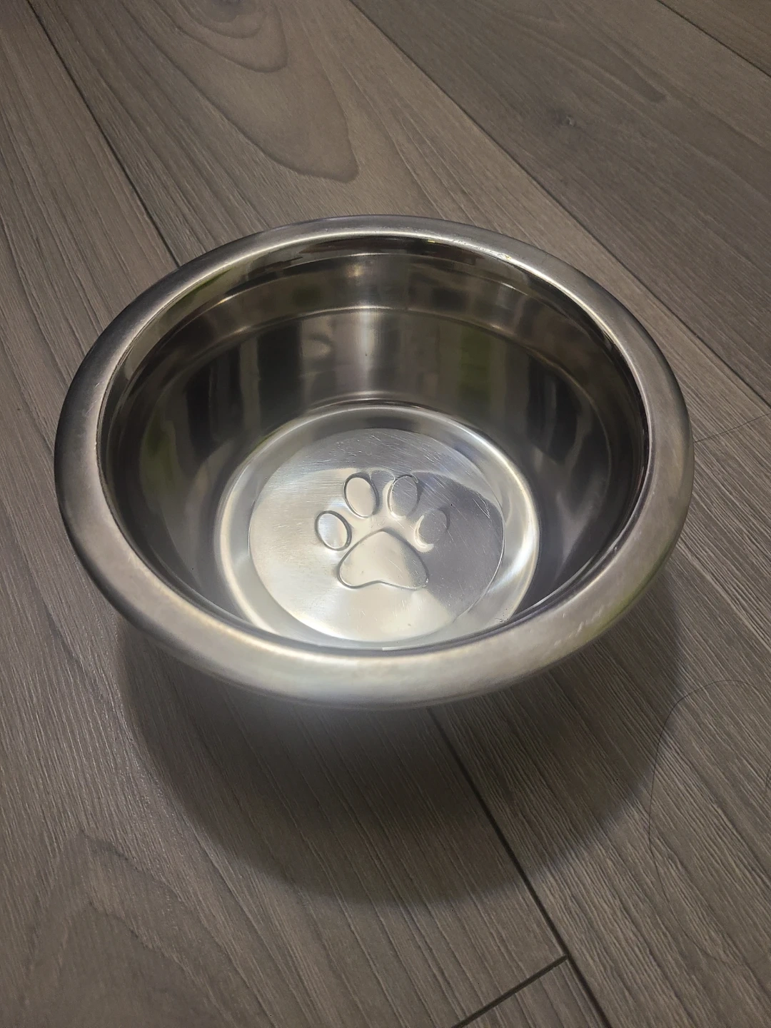 This is a stainless steel pet bowl. It features a paw print design embossed in the centre. Diameter is approximately 16cm.