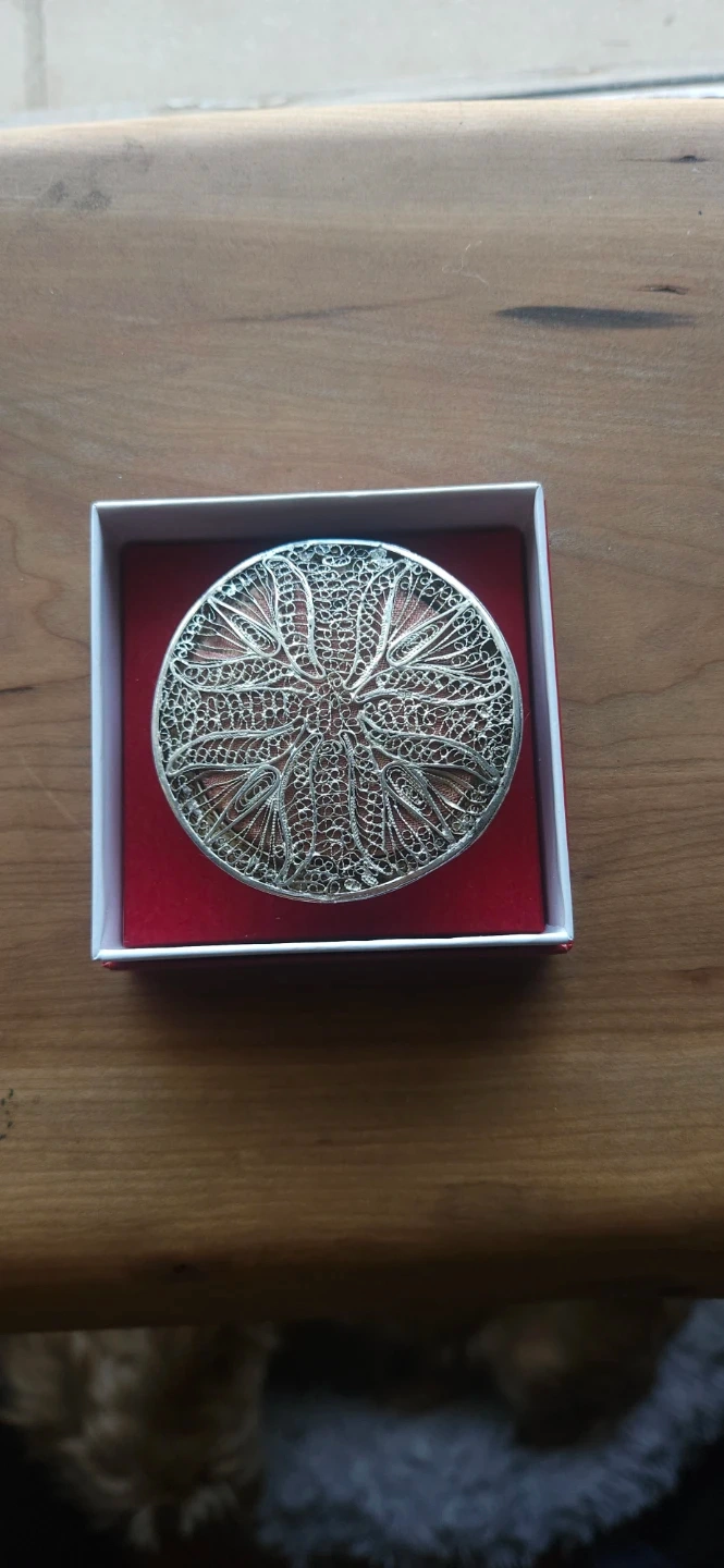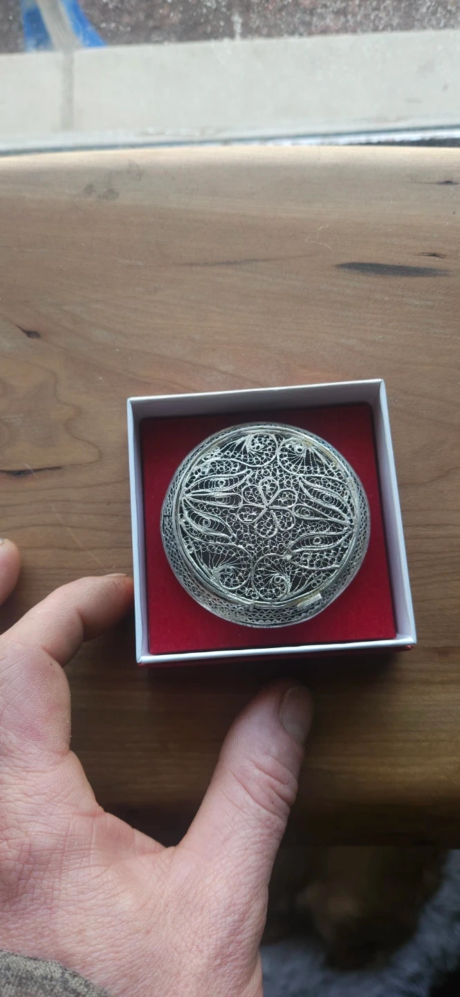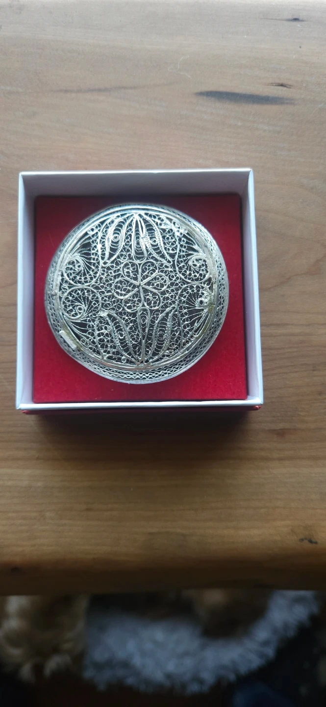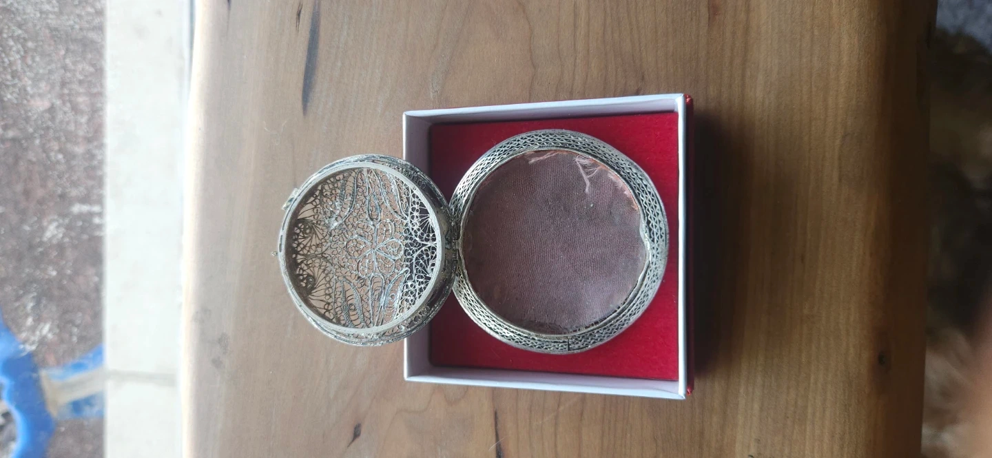 This is a beautiful round silver compact with intricate filigree detailing. It's perfect for storing small treasures or as a decorative accent. The ornate silverwork gives it a unique, vintage charm.