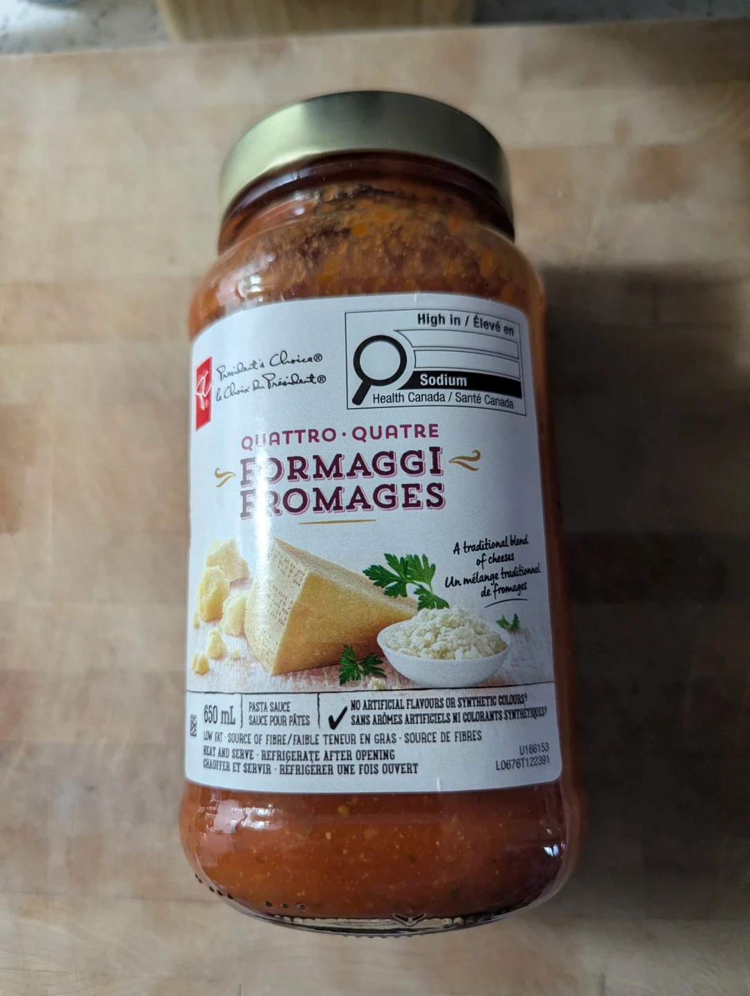 PC Quattro Formaggi pasta sauce is a traditional blend of four cheeses. It's made with no artificial flavours or colourants. This sauce has 650ml of product. Refrigerate after opening.