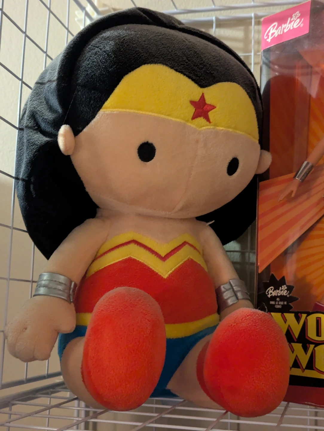 This is a plush toy of Wonder Woman. It's made of soft, fuzzy material with embroidered details. This plush would be great for any fan of the DC Comics hero!