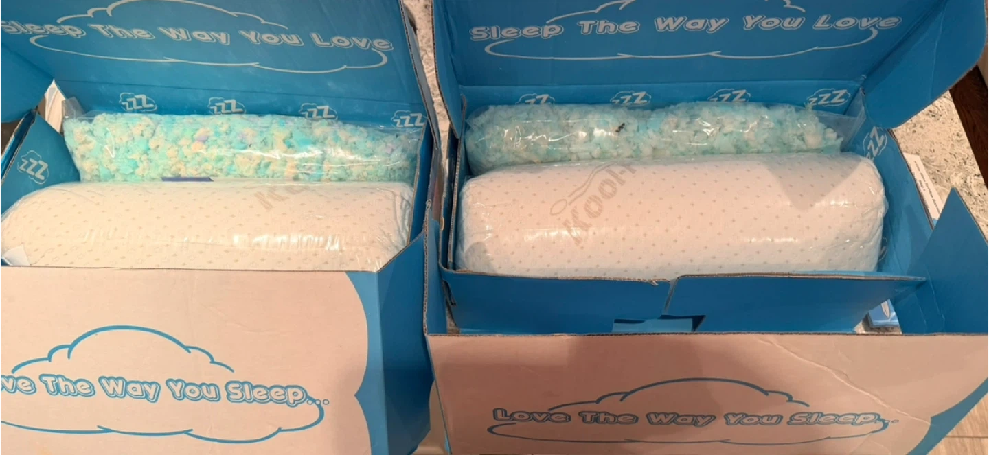 Adjustable shredded memory foam pillow with a Kool-Flow Micro-Vented bamboo cover. Comes with additional fill for customization. Queen size x2.