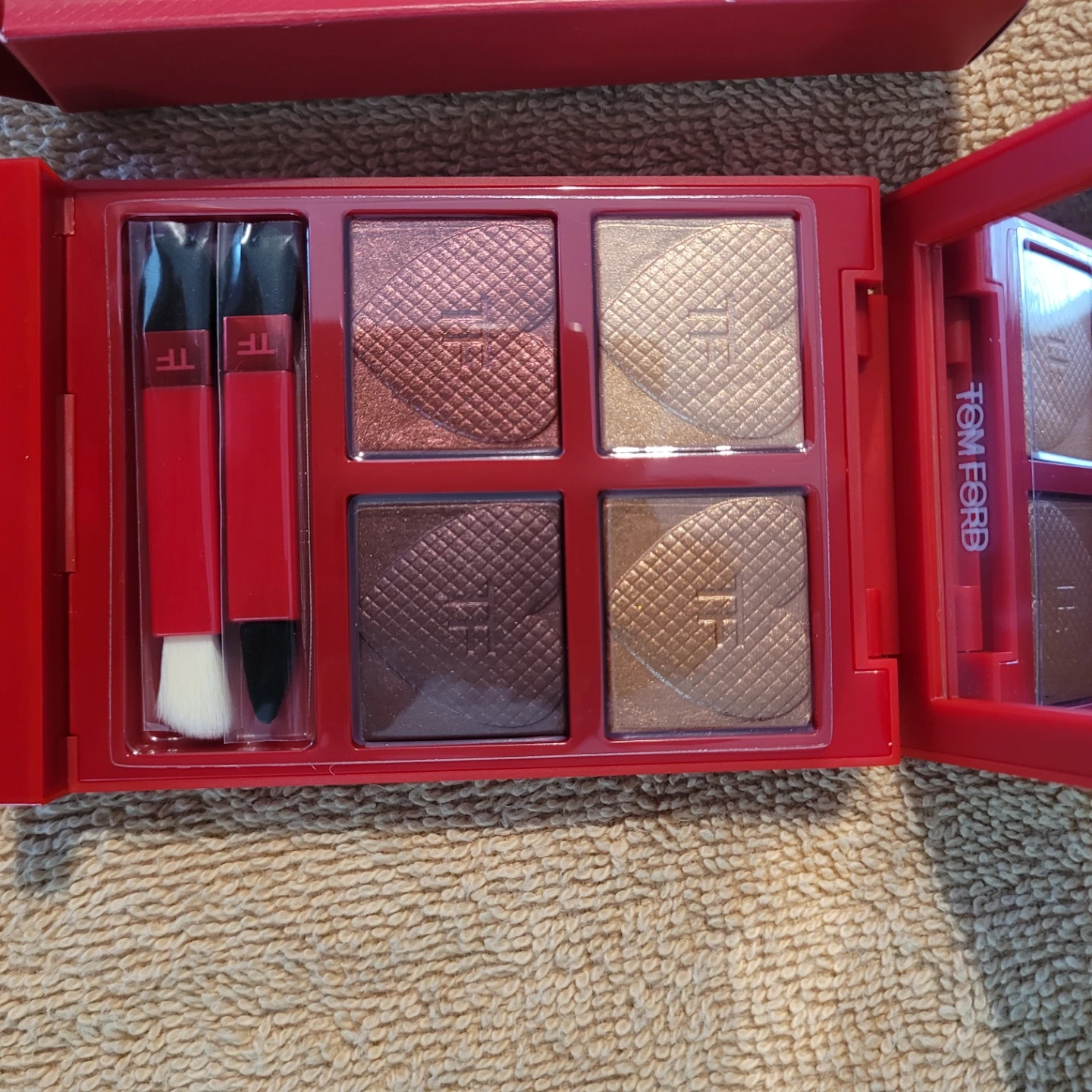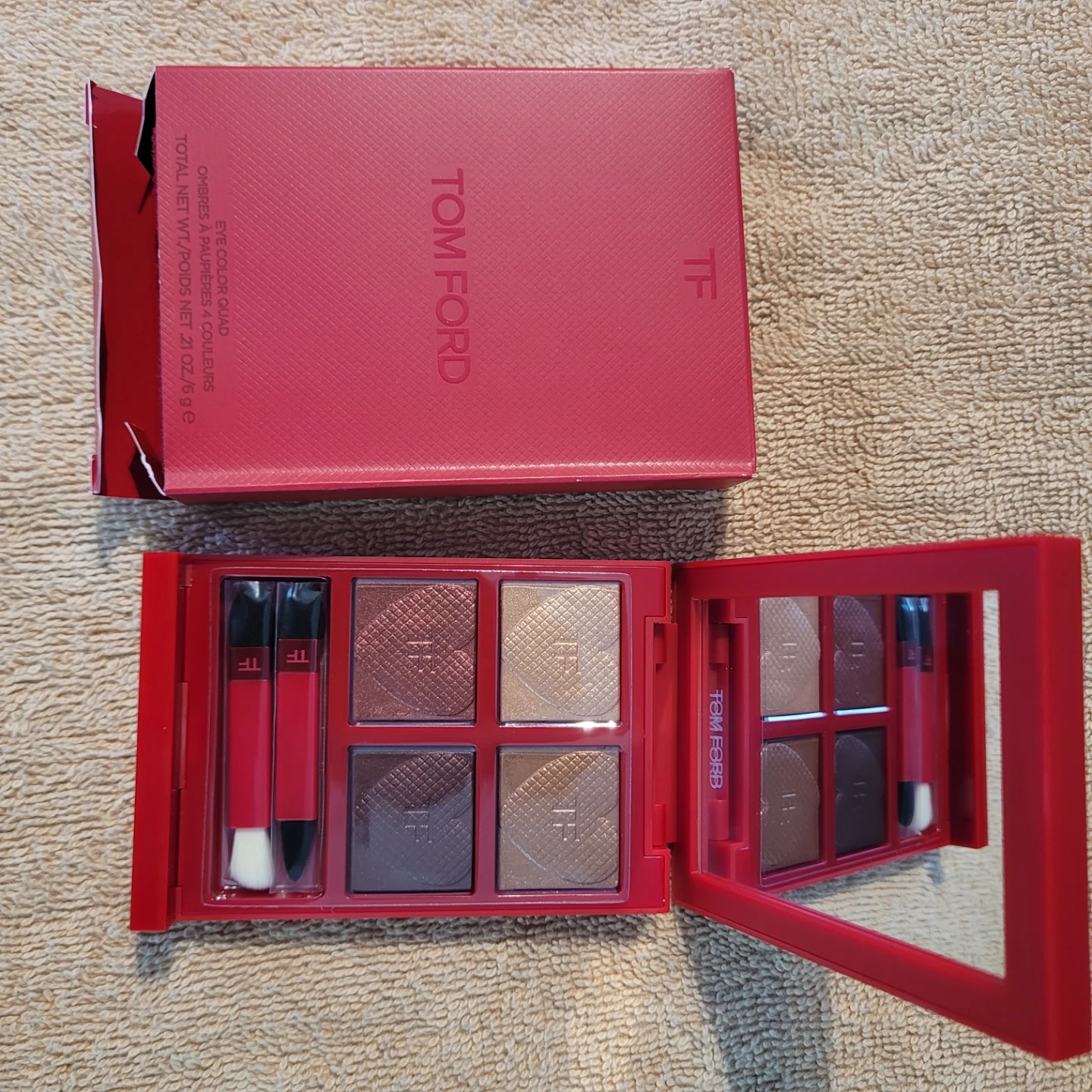 This is a Tom Ford Eye Colour Quad eyeshadow palette. It includes four shimmery eyeshadow shades. The palette comes with an applicator and a velvet pouch.