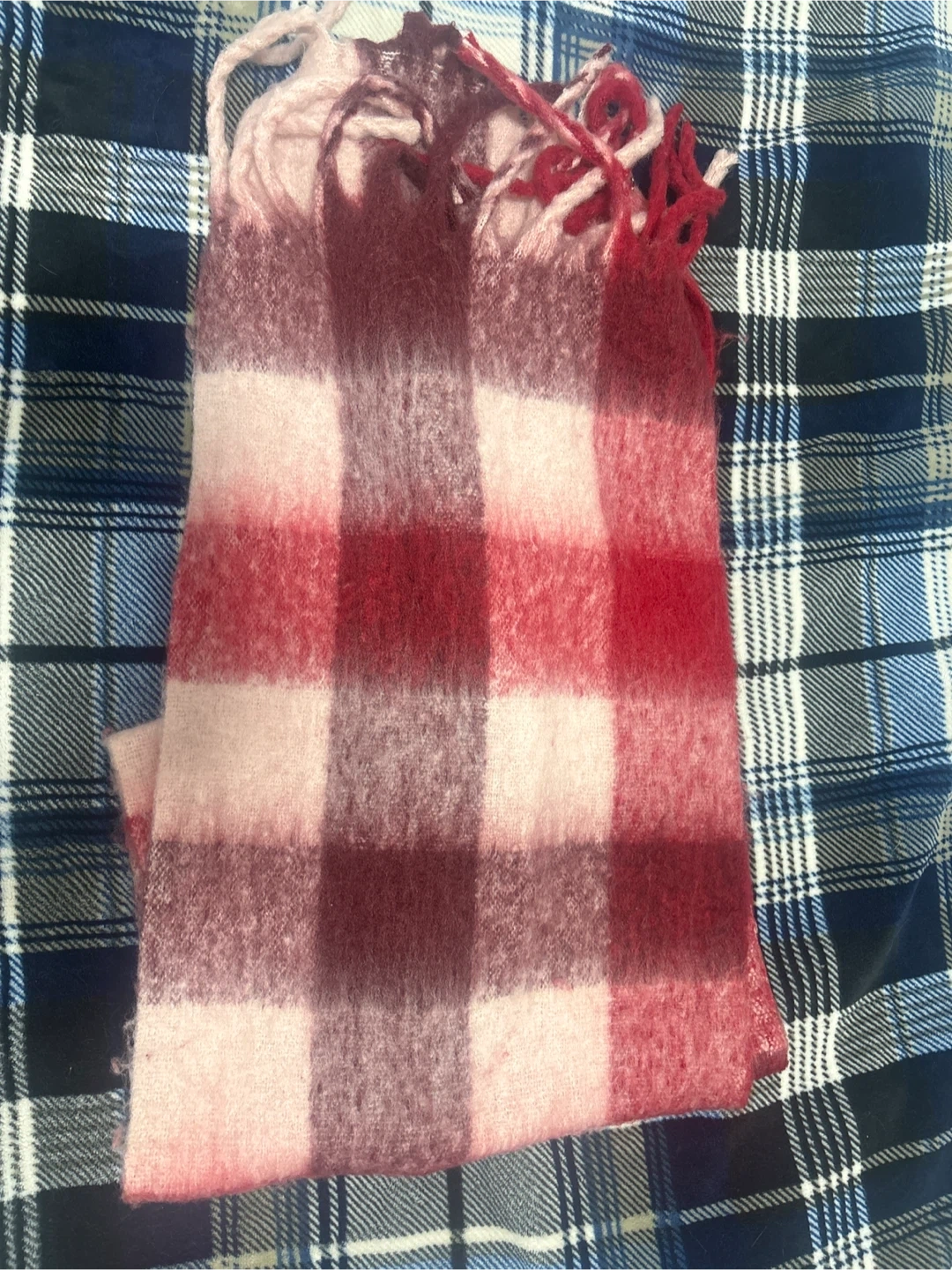 Cozy plaid scarf featuring pink, burgundy, and white checks. It has fringed edges for a touch of style. This scarf is made of a soft, fuzzy material perfect for cooler weather. Pick up cash only