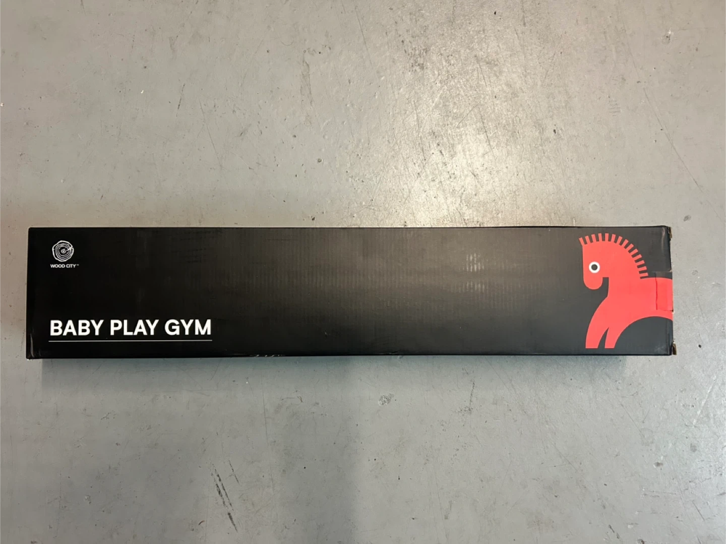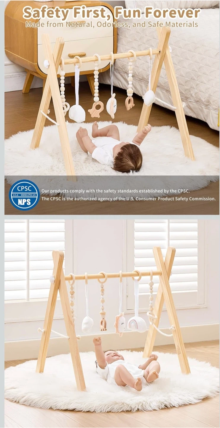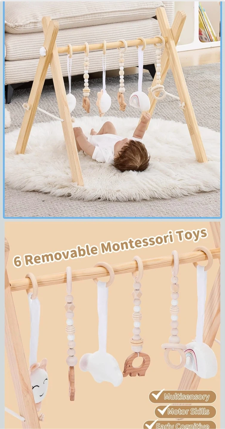 This wooden baby play gym is made from safe, odorless pine wood with smooth edges. It comes with 6 removable Montessori toys designed to engage your baby. The gym is easy to assemble with no tools required and folds for storage.