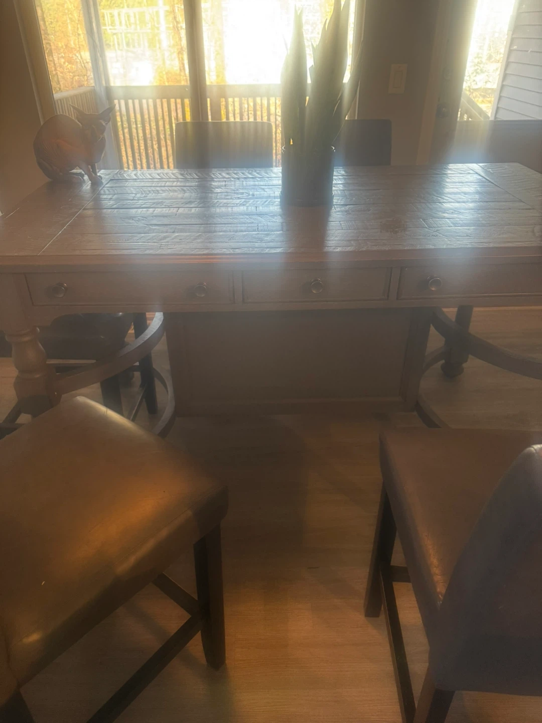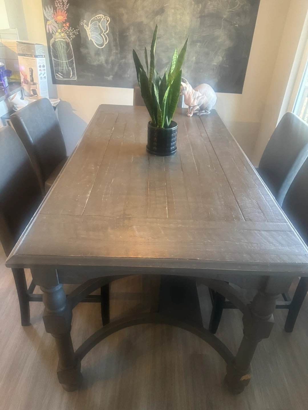 Rustic farmhouse dining table. Wood construction with a distressed grey finish. It has six drawers for extra storage. Seats six people comfortably.
