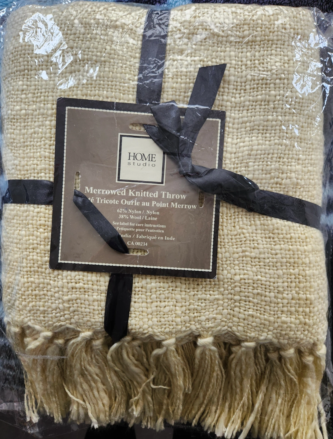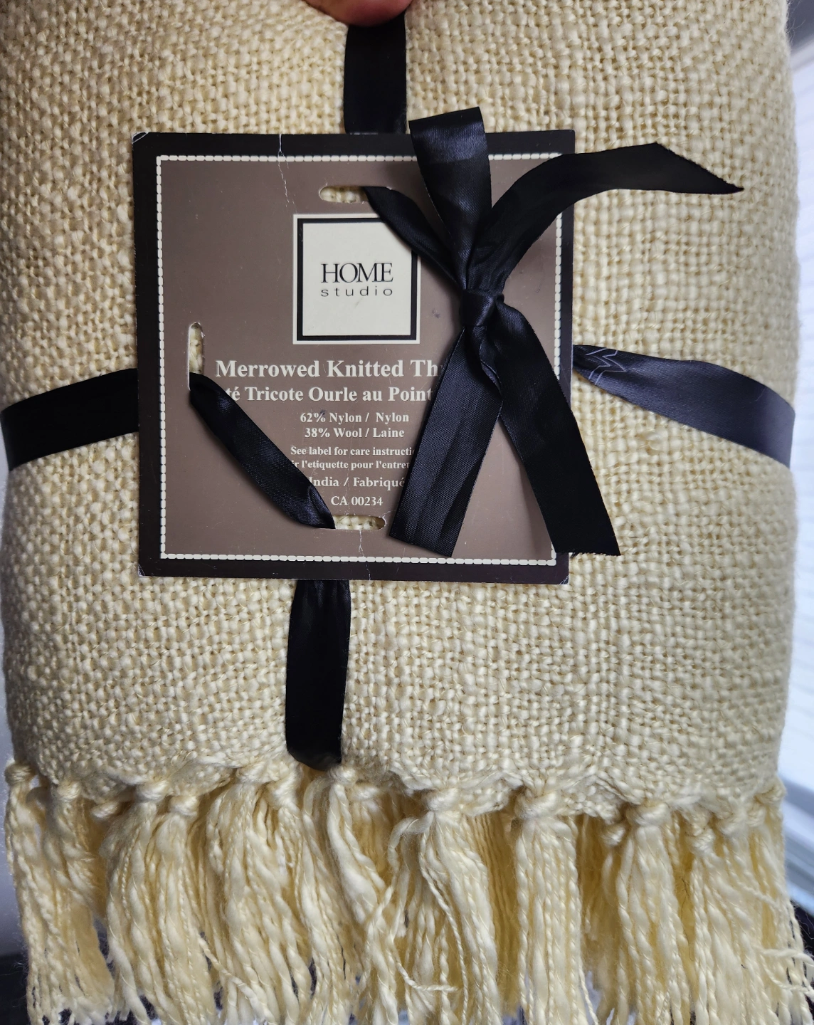 Cream-coloured throw blanket. Features a merrowed edge and fringe. 62% nylon, 38% wool. Made in India.