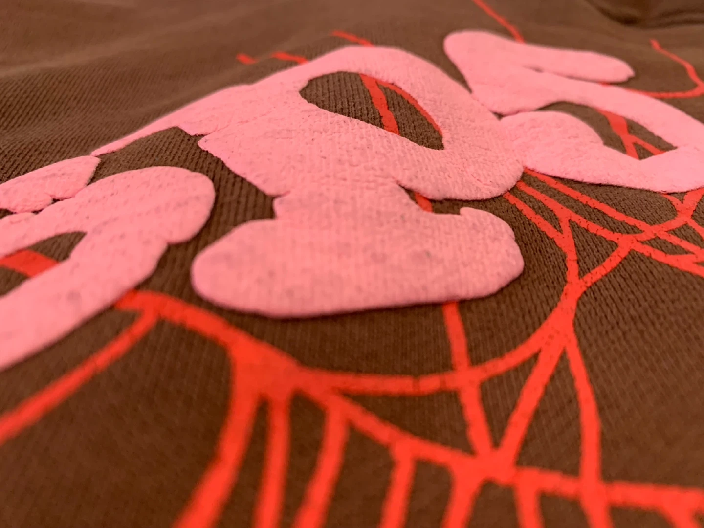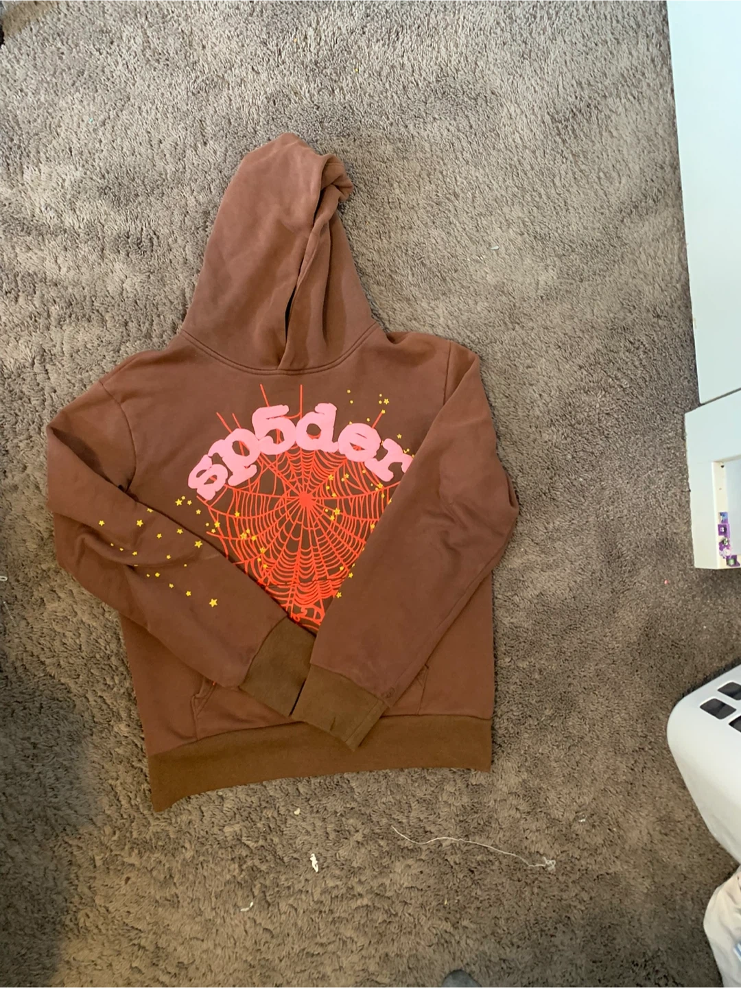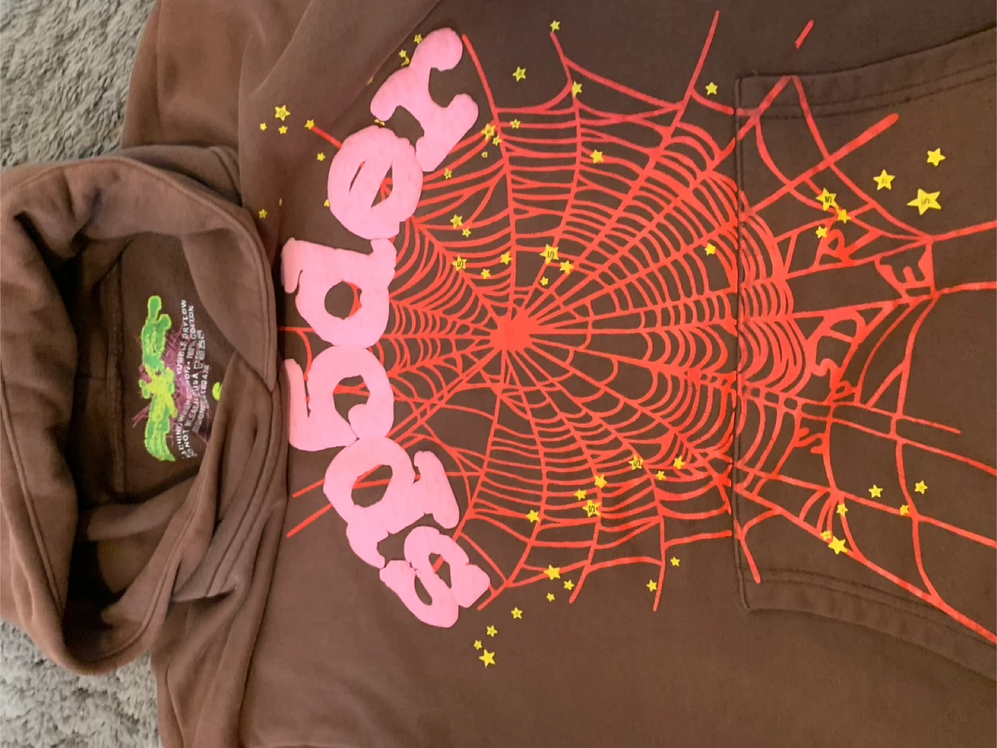 Brown Spider hoodie with pink and red graphic. It's 100% cotton. Designed in USA. Size S.