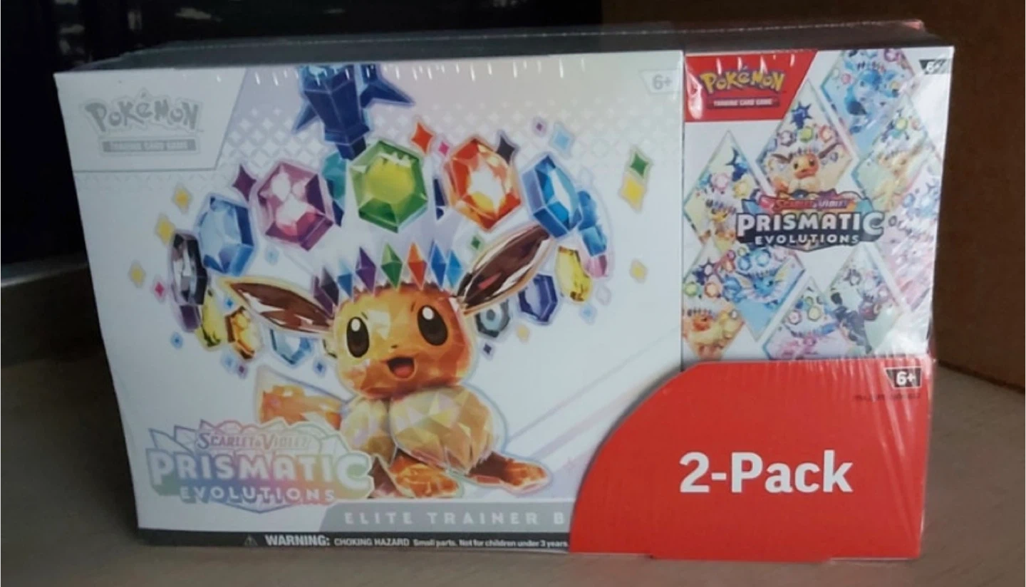 This is a Pokemon Scarlet & Violet Prismatic Evolutions Elite Trainer Box 2-Pack. It's recommended for ages 6 and up. The box contains cards from the Prismatic Evolutions set