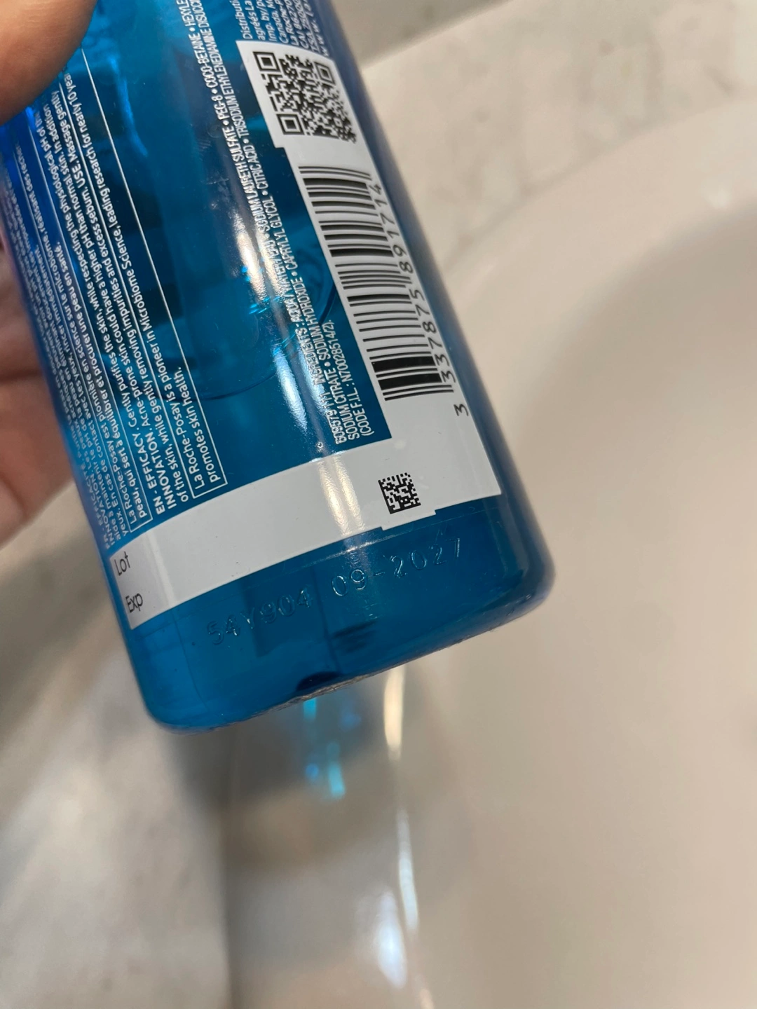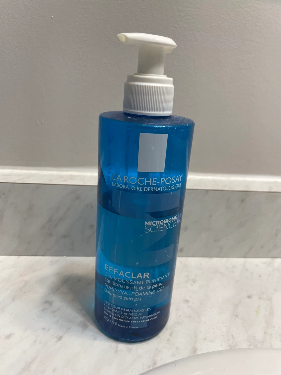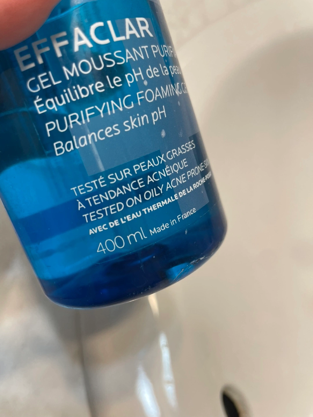 La Roche-Posay Effaclar purifying foaming gel cleanser for oily and acne-prone skin. It balances skin pH and is tested on oily acne-prone skin. 400 ml bottle. Made in France.