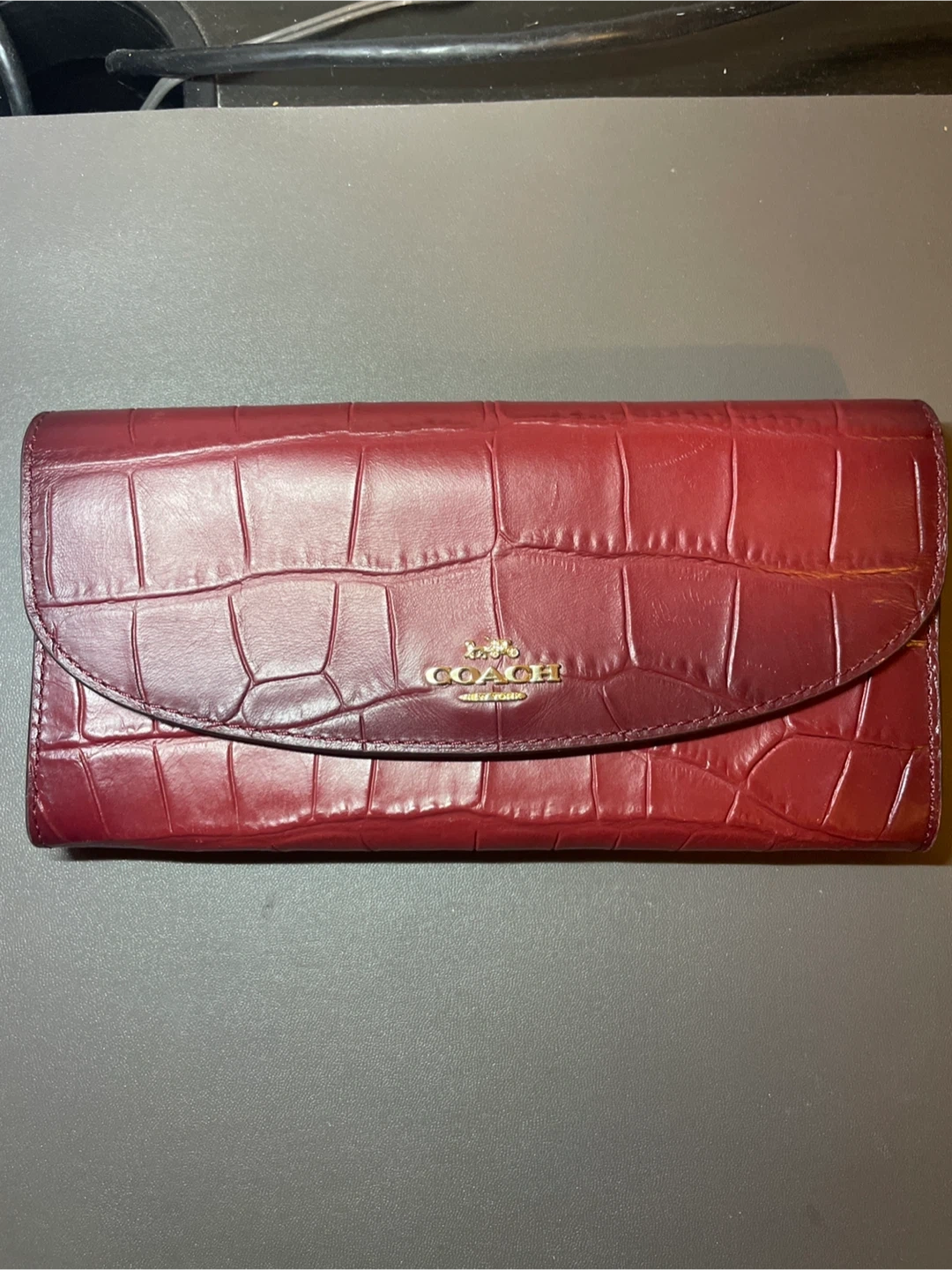 Gently used stylish Coach wallet in a deep red with a croc-embossed finish. It's made of genuine leather and features a snap closure with multiple card slots and a zippered coin pocket inside. Great for keeping your essentials organized!
