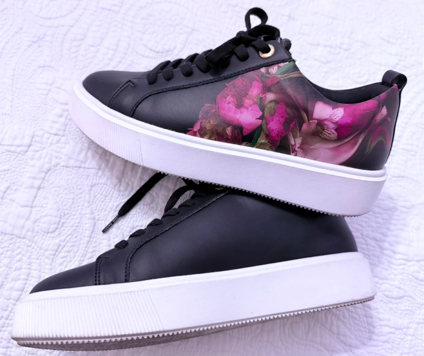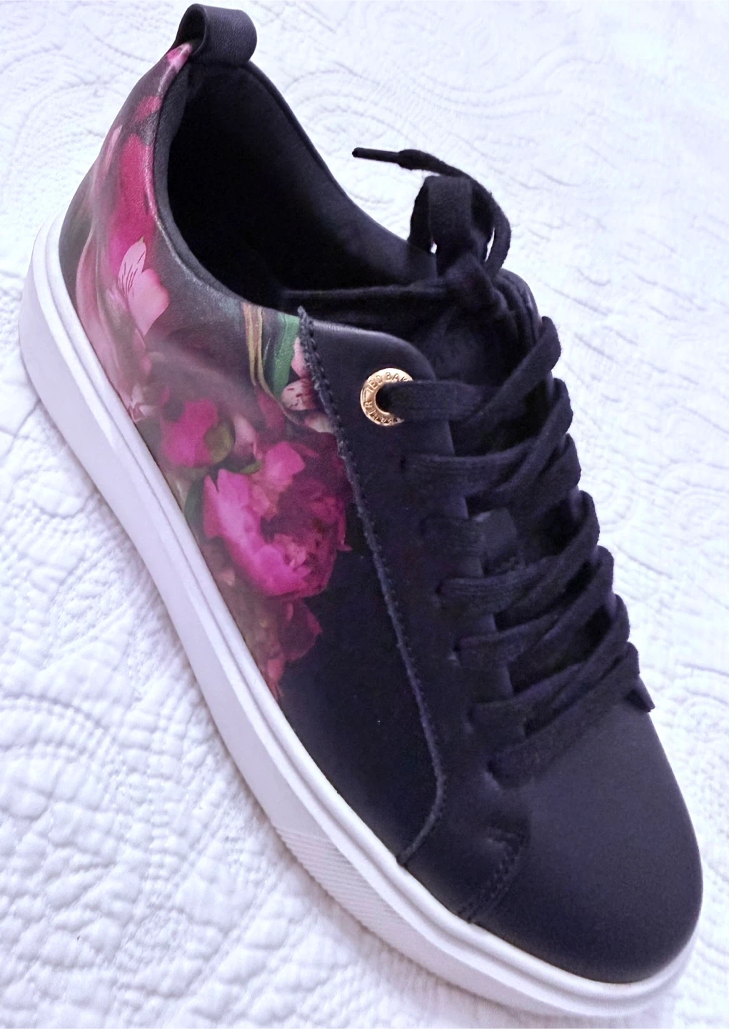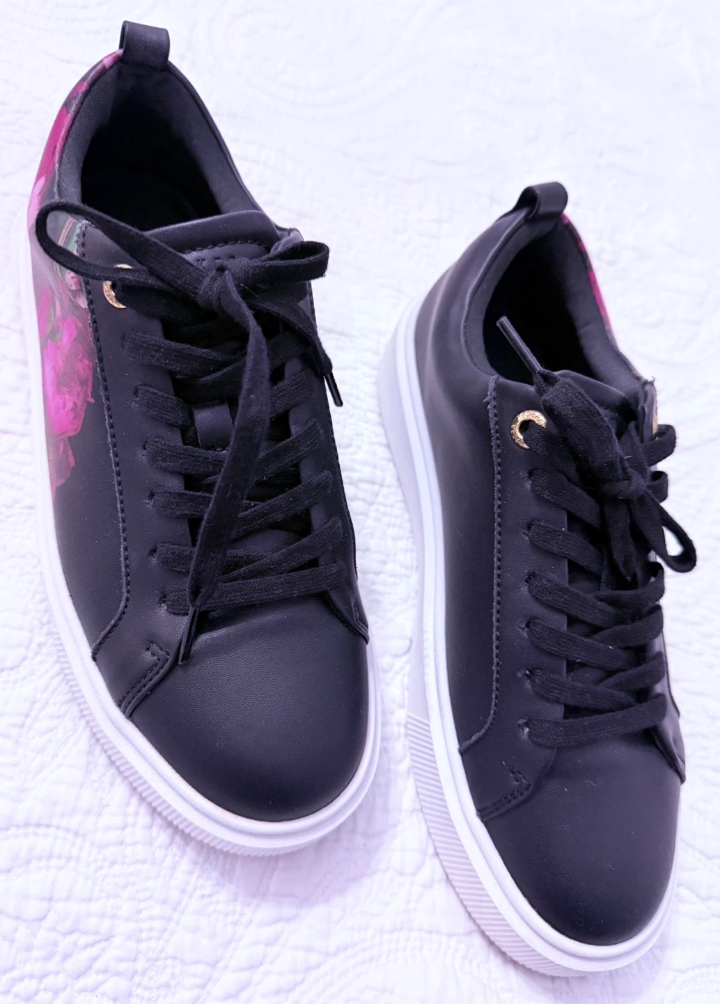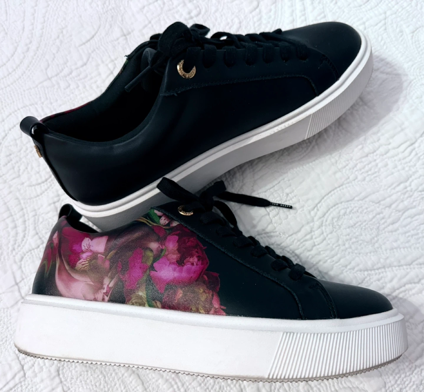 Stylish black Ted Baker sneakers with a vibrant floral print. These lace-up shoes feature a comfortable platform sole. They're perfect for adding a pop of colour to any casual outfit!