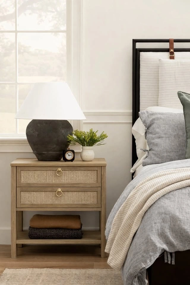 Warm wood tables featuring two drawers with woven rattan fronts. Perfect as nightstands, side tables, end tables, or as stylish extra storage in a bedroom, living room, or home office.