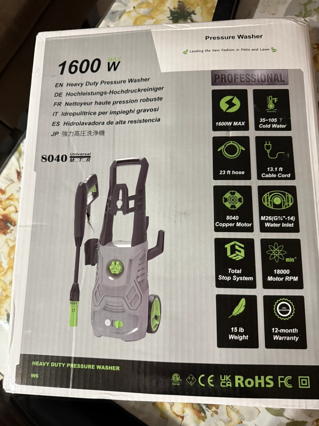 This is a 1600W heavy duty pressure washer with a 16 ft hose and a Turbo Motor for more power. It's designed for cleaning various home exterior surfaces. Includes essential accessories for immediate use.