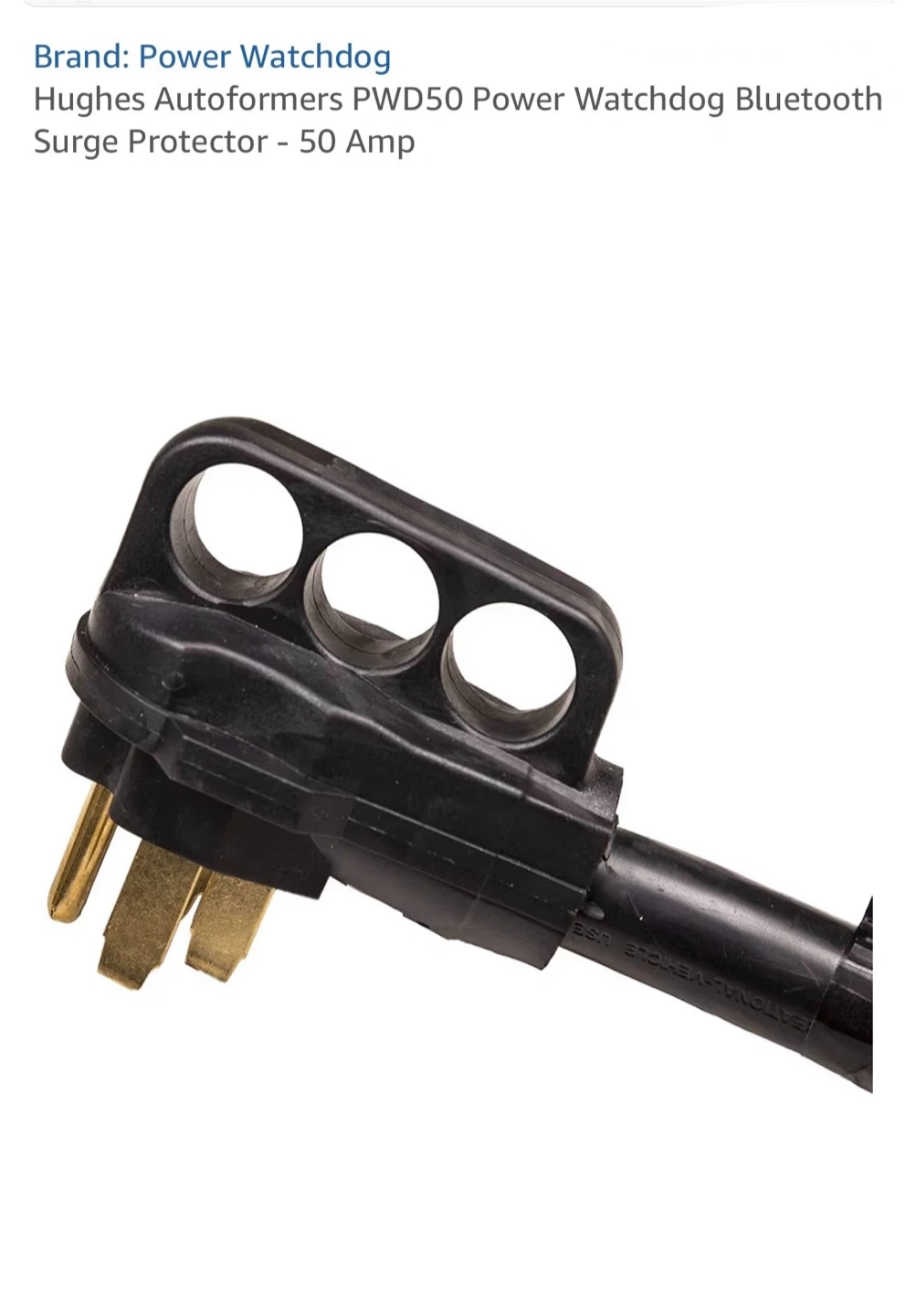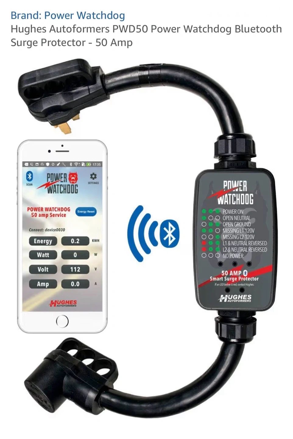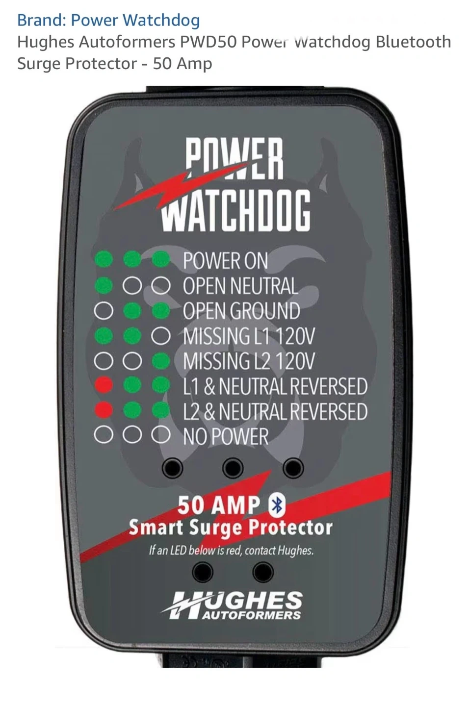 This is a Hughes Auttoformers Power Watchdog PWD50 Bluetooth Smart Surge Protector. It's 50 Amp rated and connects via Bluetooth to monitor power. It has LEDs to indicate power status and potential issues.