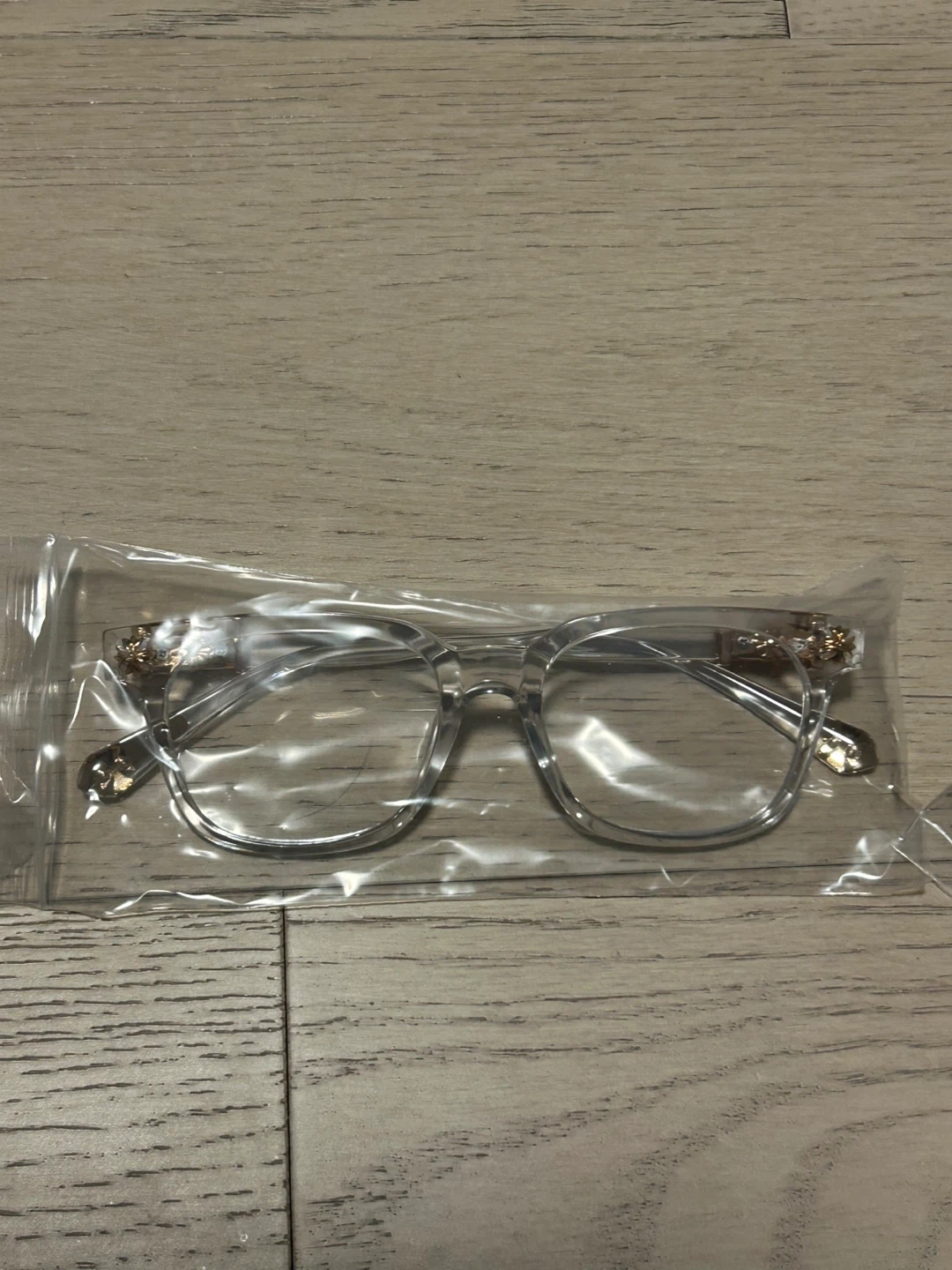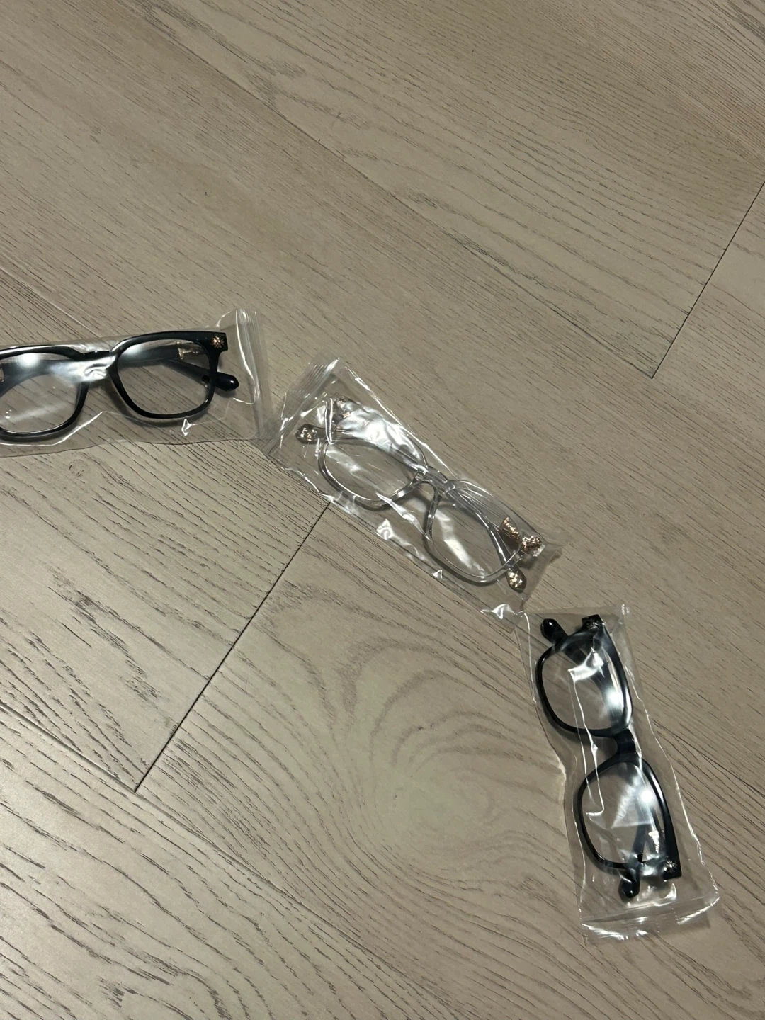 Includes three pairs of eyeglasses with black and clear frames. Each pair is individually packaged. These glasses have decorative detailing on the temples.