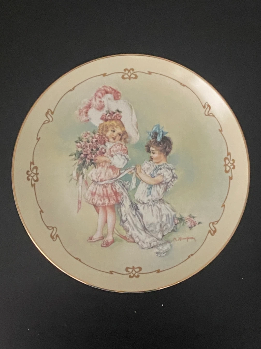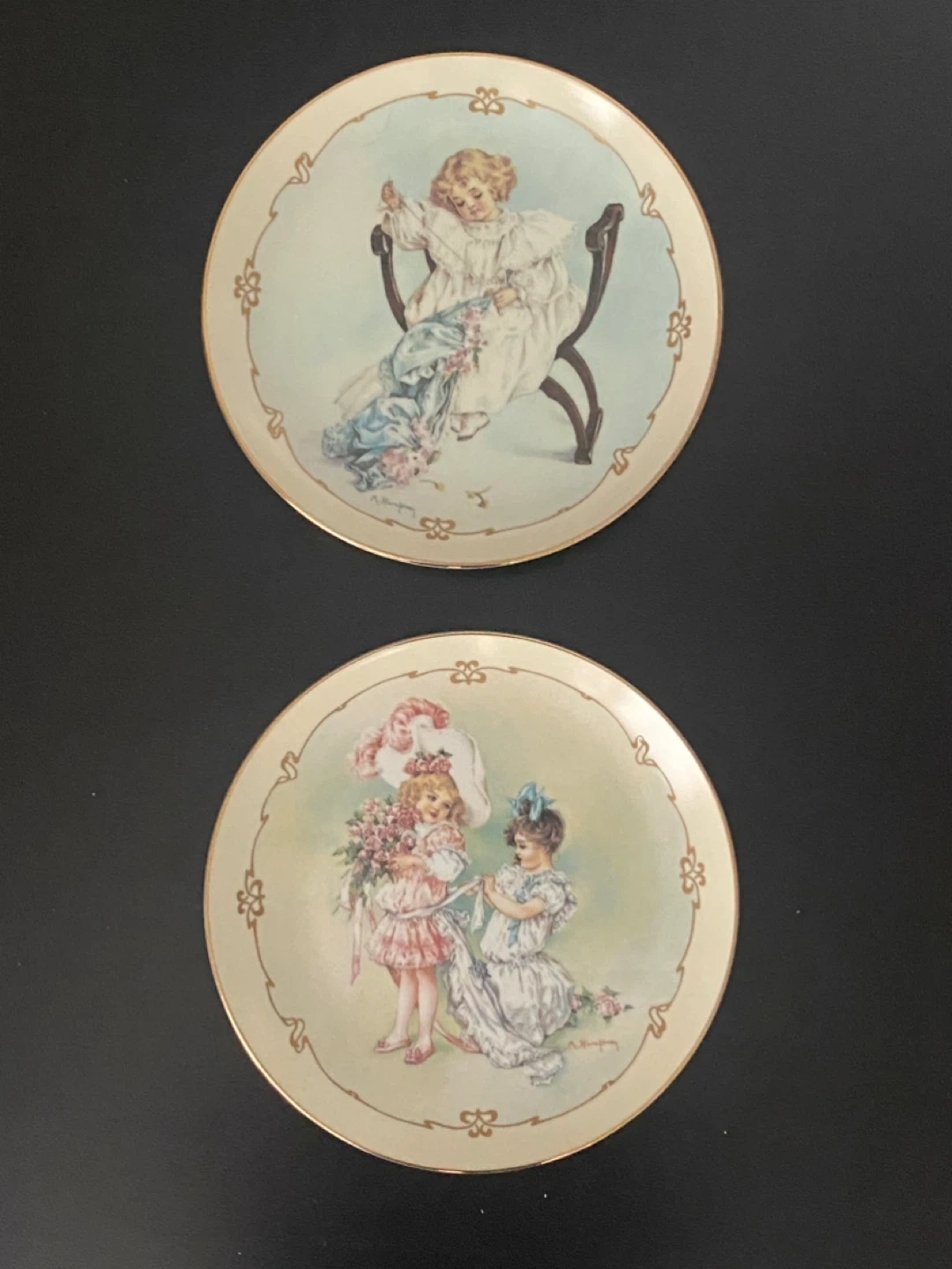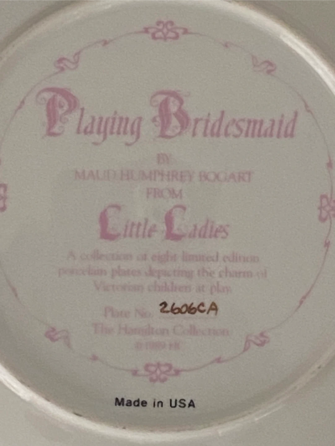 Two limited edition porcelain plates from The Hamilton Collection, "Playing Bridesmaid" and "The Seamstress," featuring artwork by Maud Humphrey Bogart (Humphrey Bogarts Mom) from the "Little Ladies" collection.