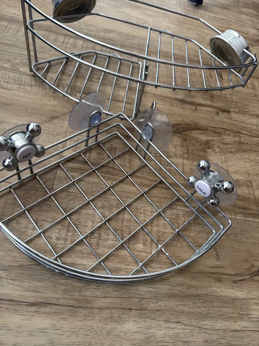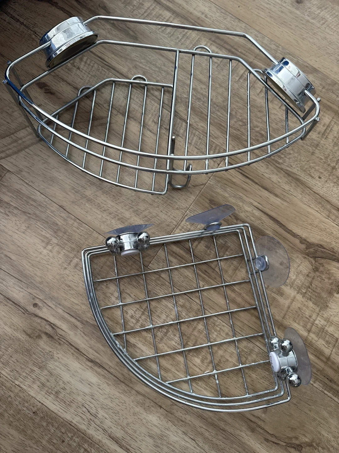 Two chrome-plated wire corner shower caddy organizers. Each caddy features suction cups for mounting. One caddy has a hook for hanging. Great for storing toiletries!