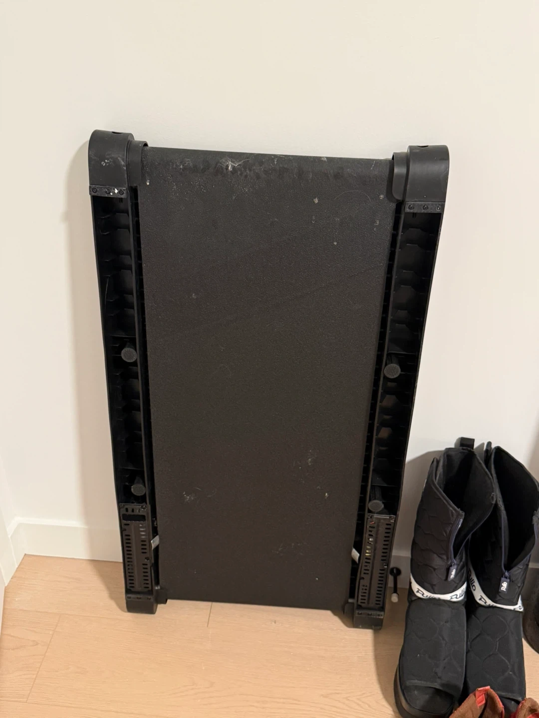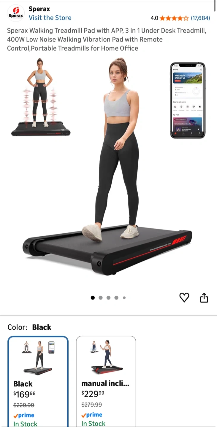 This is a Sperax walking treadmill. It's black and designed for under-desk use. It's a low-noise walking pad.