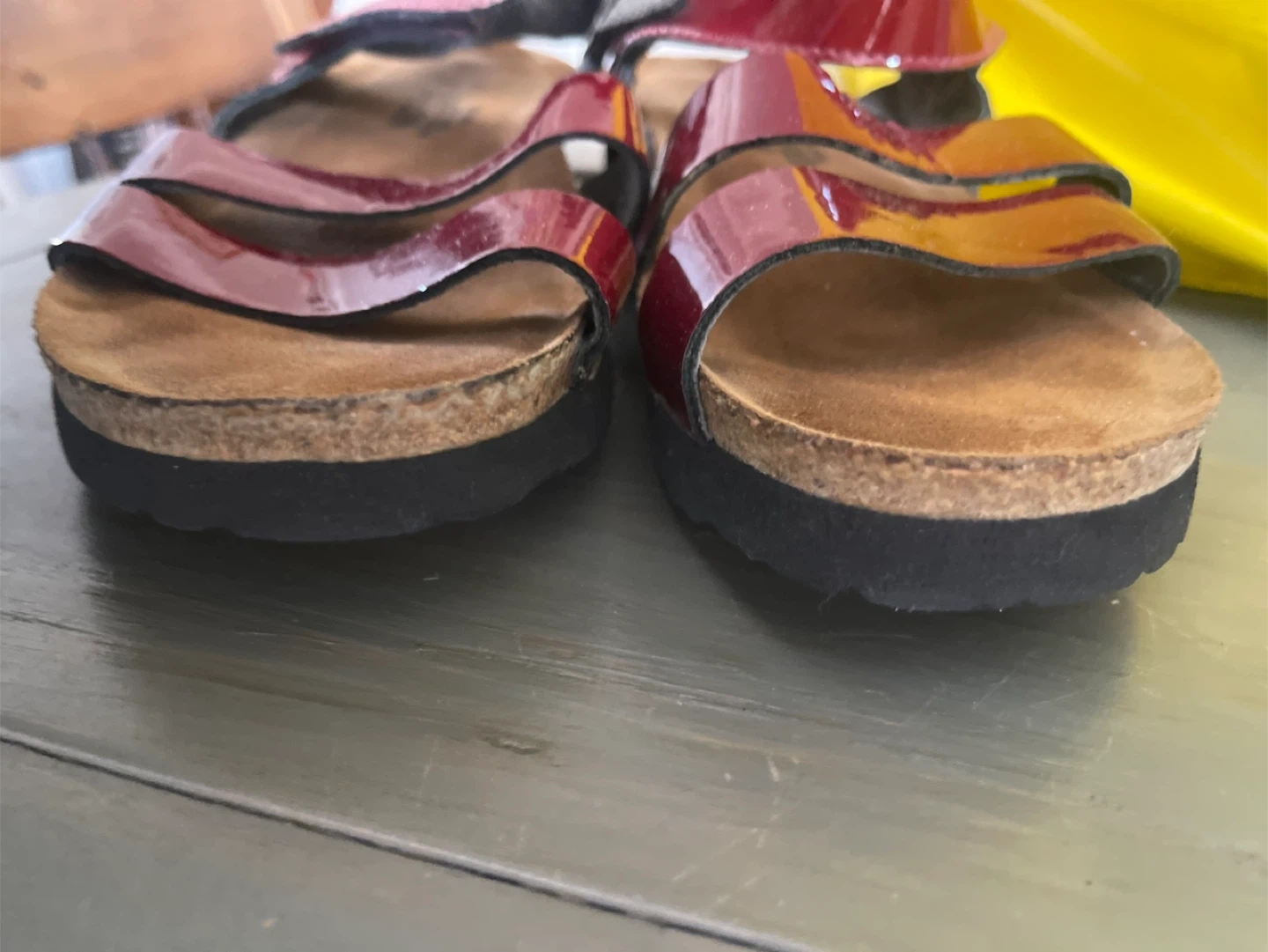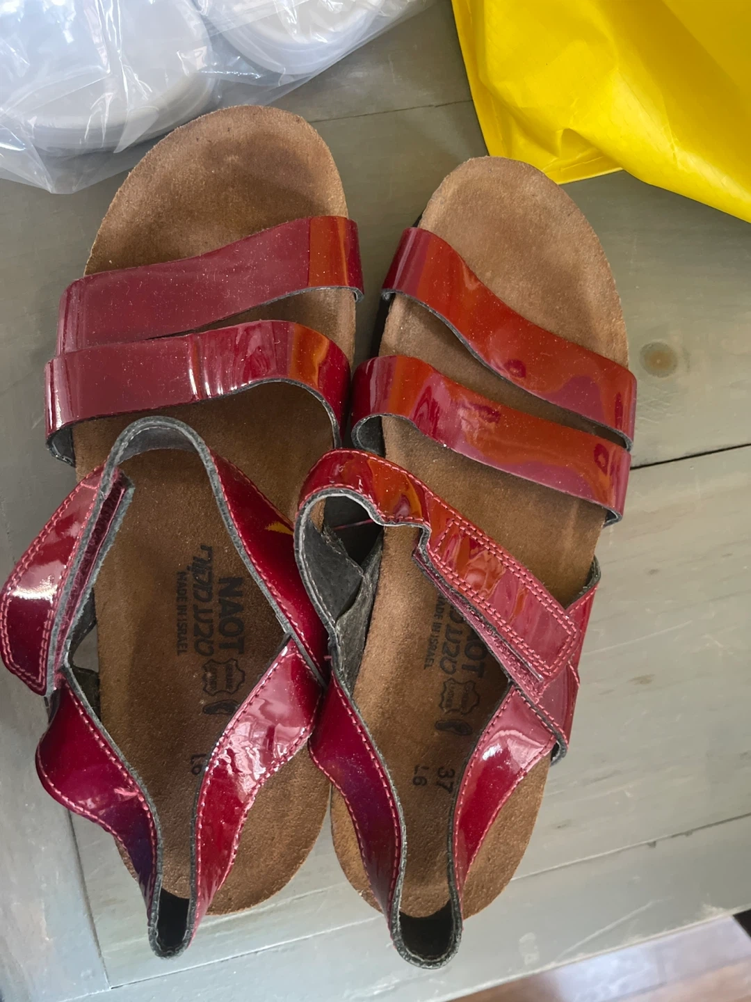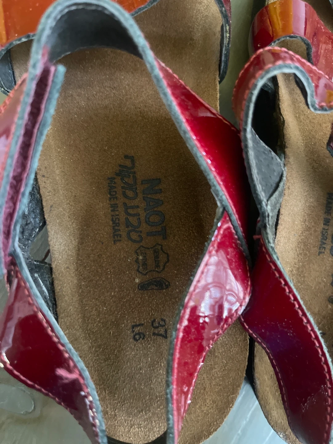 These Naot sandals feature a stylish red patent leather design. They are made in Israel and have a cork footbed for comfort. The size is 37.
