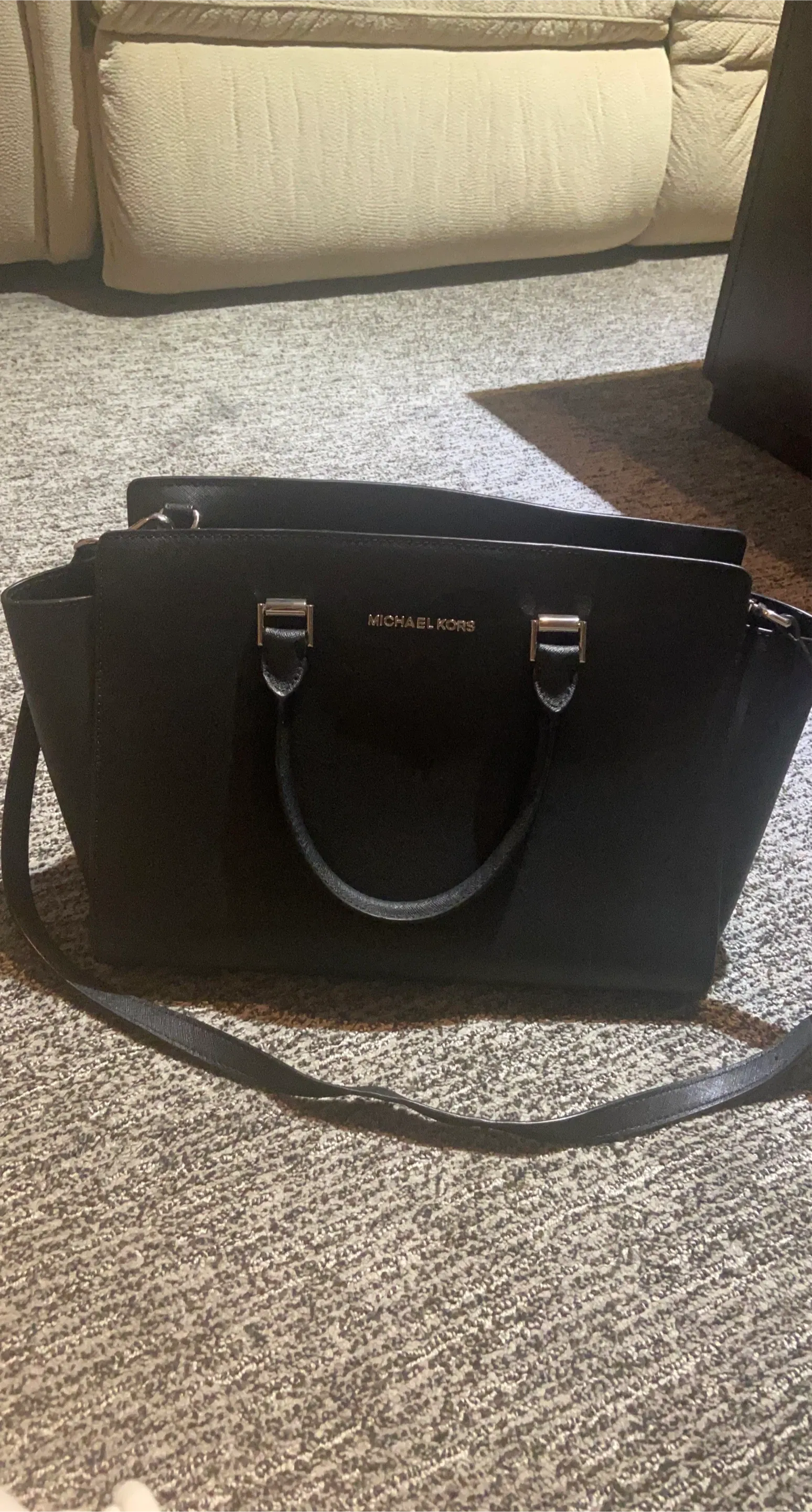 This is a classic black leather tote bag from Michael Kors. It features dual top handles and an optional shoulder strap. This versatile bag is perfect for everyday use. Leather exterior.