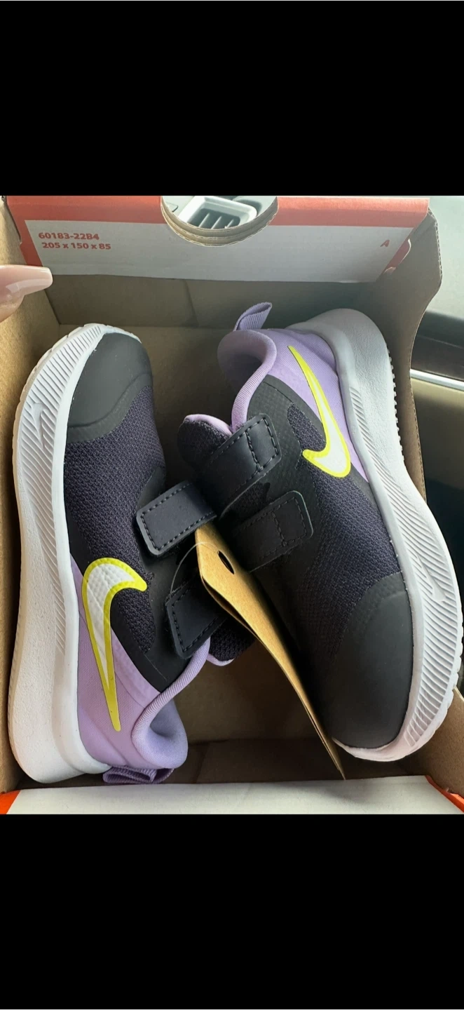 These Nike Star Runner 3 (TDV) shoes are in a purple, white, and lilac colourway. They're a toddler size 8c. These shoes come in their original box.