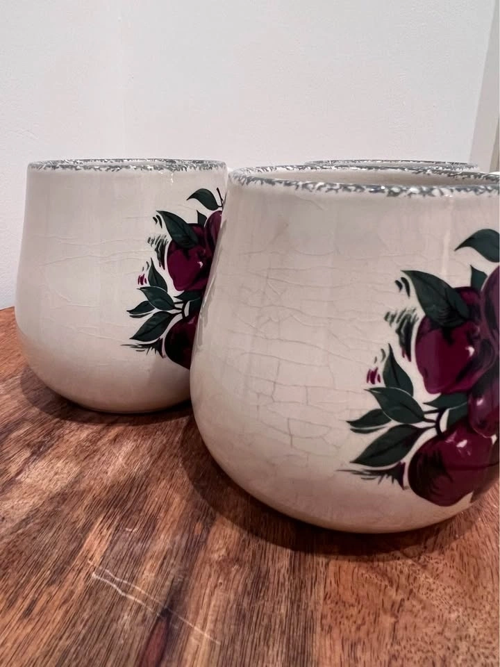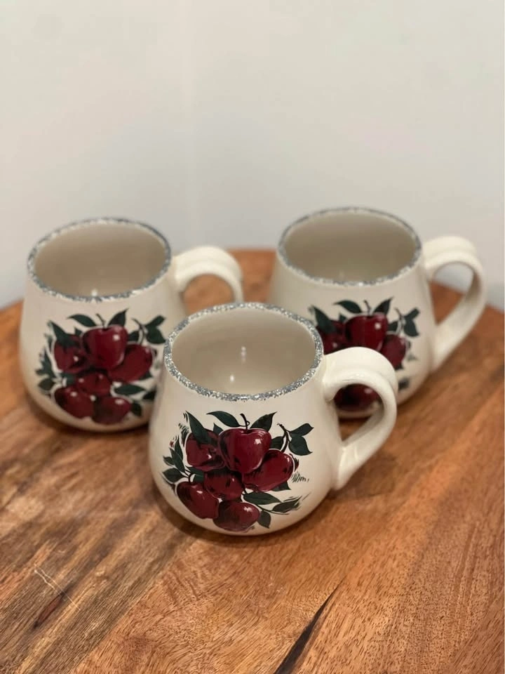 These bulbous, hand-painted mugs from Home & Garden Party feature a charming "Apple Cluster" pattern, known for their rustic appeal and collectible value. Made from durable stoneware, they are microwave, dishwasher, and oven safe. Dimensions are approximately 3 7/8 inches in height and 3 3/8 inches in width. Preowned. Pickup is at 58th and 7th Ave in midtown Manhattan.