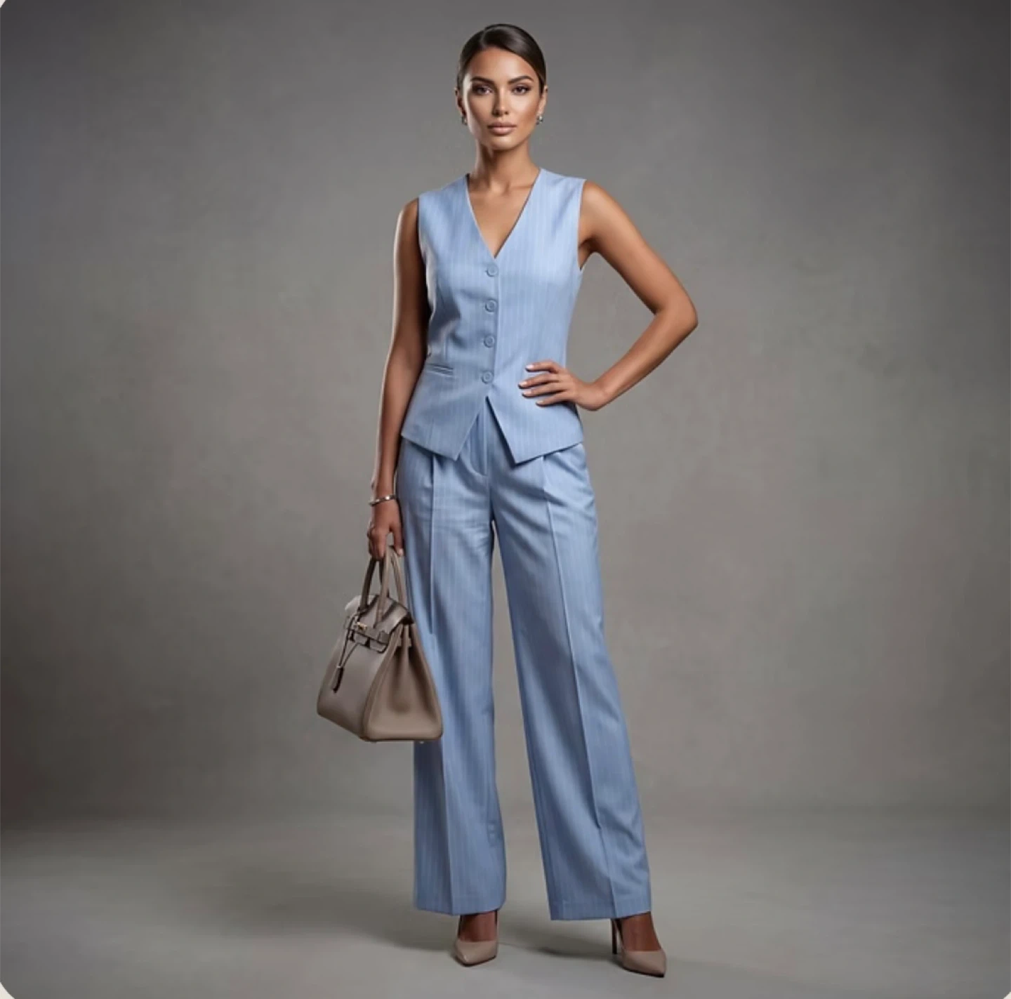 This is a light blue pinstripe vest and matching wide-leg pants suit set. It's made of a lightweight fabric, perfect for warmer weather. This ensemble offers a polished and professional look!