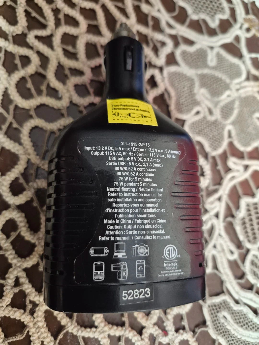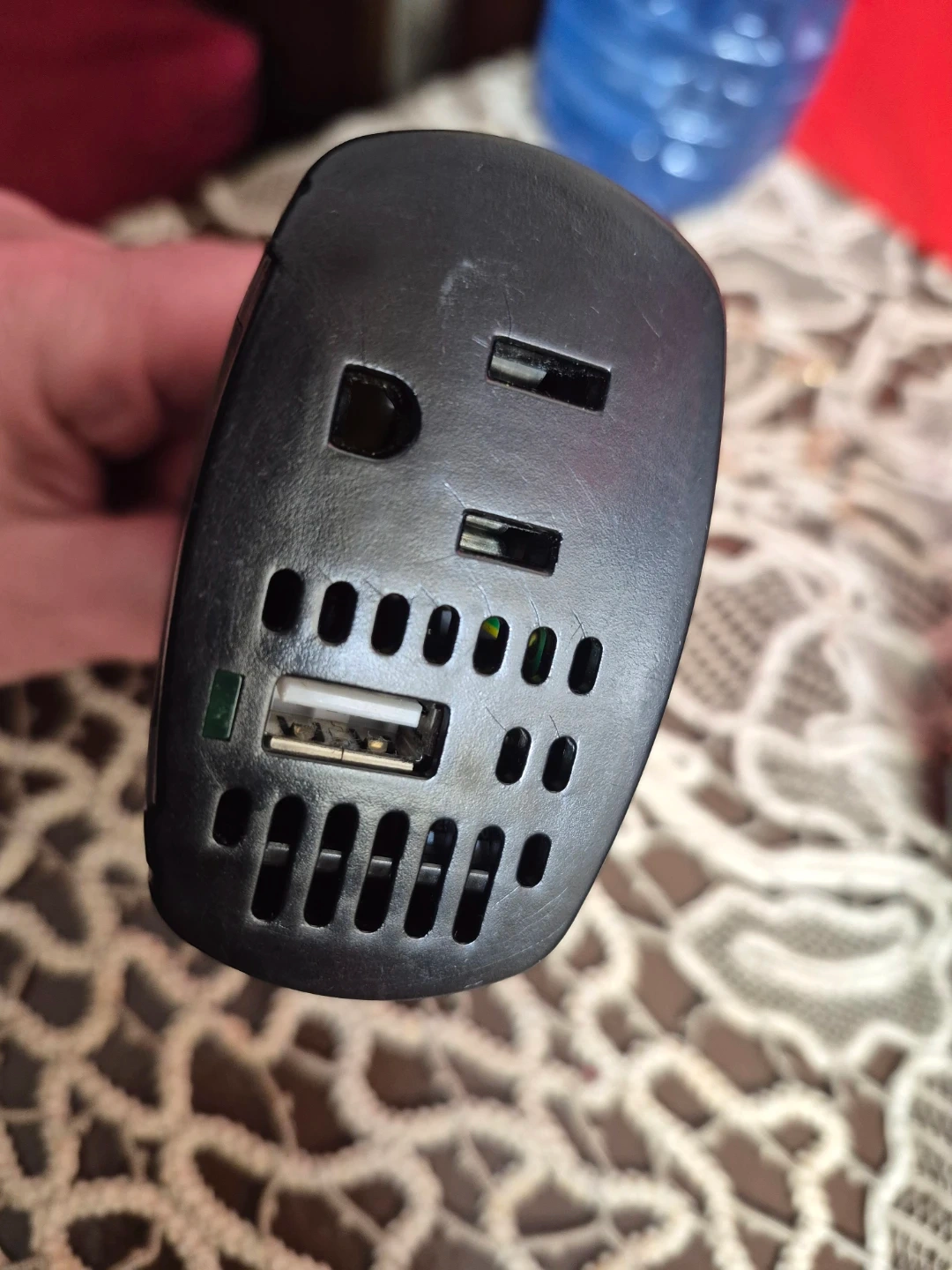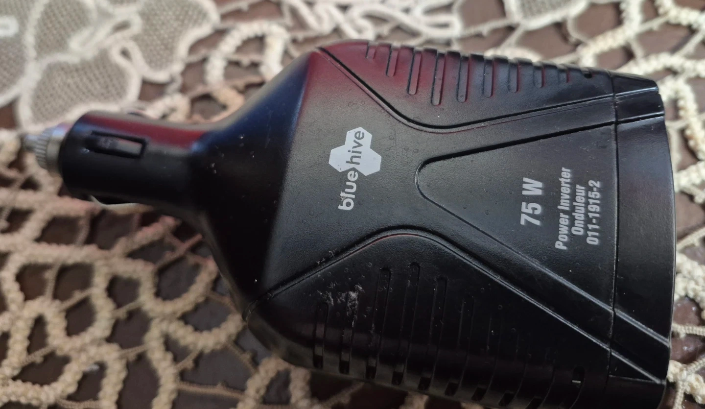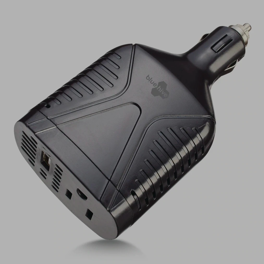 Blue Hive 75W power inverter with multiple USB ports. It provides 115V AC output for small electronics and 5V DC for USB devices. This inverter's neutral floating design is suitable for automotive use.
