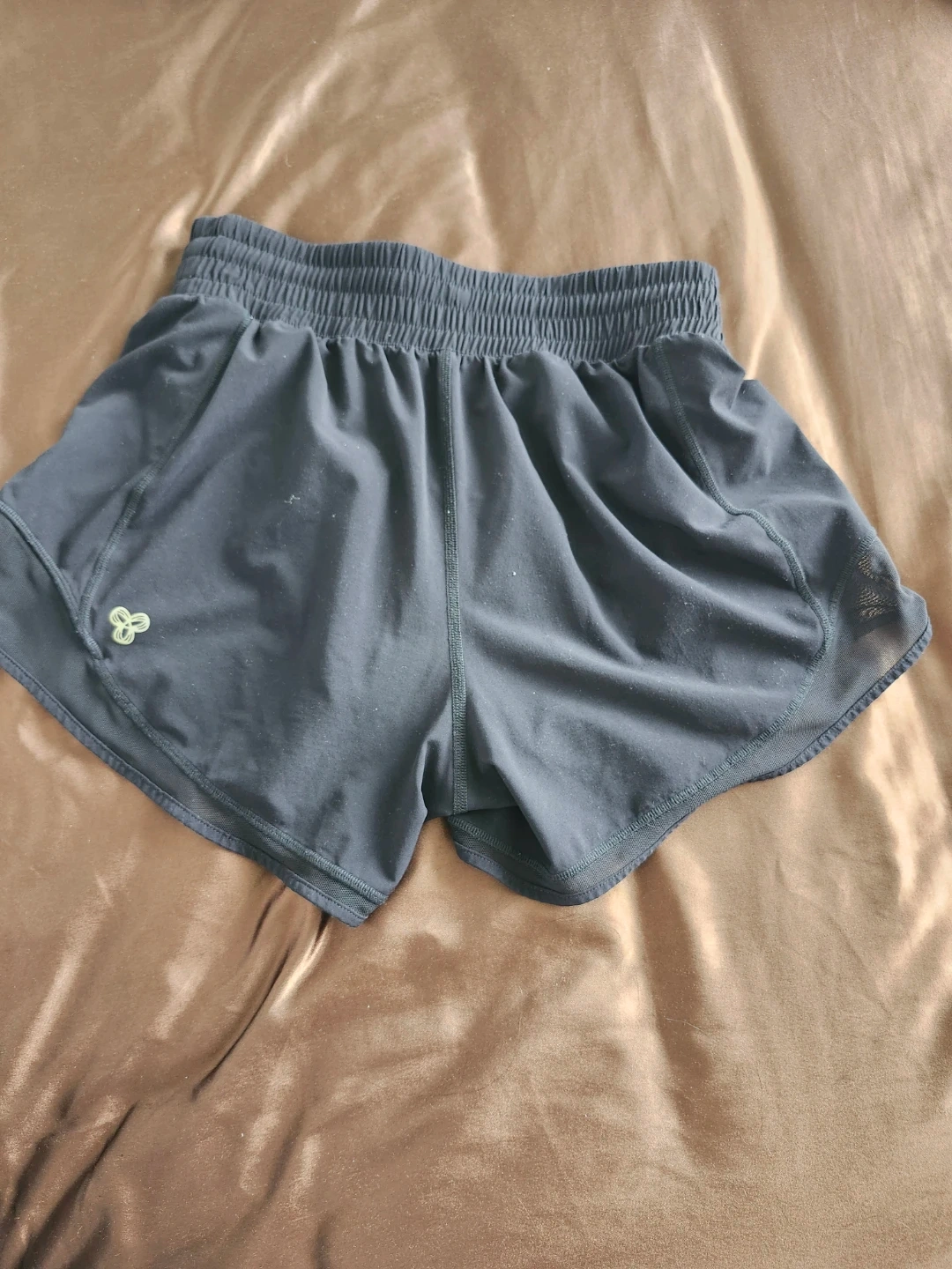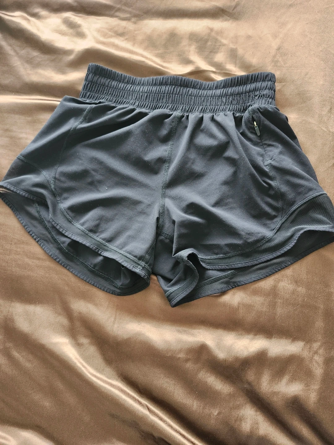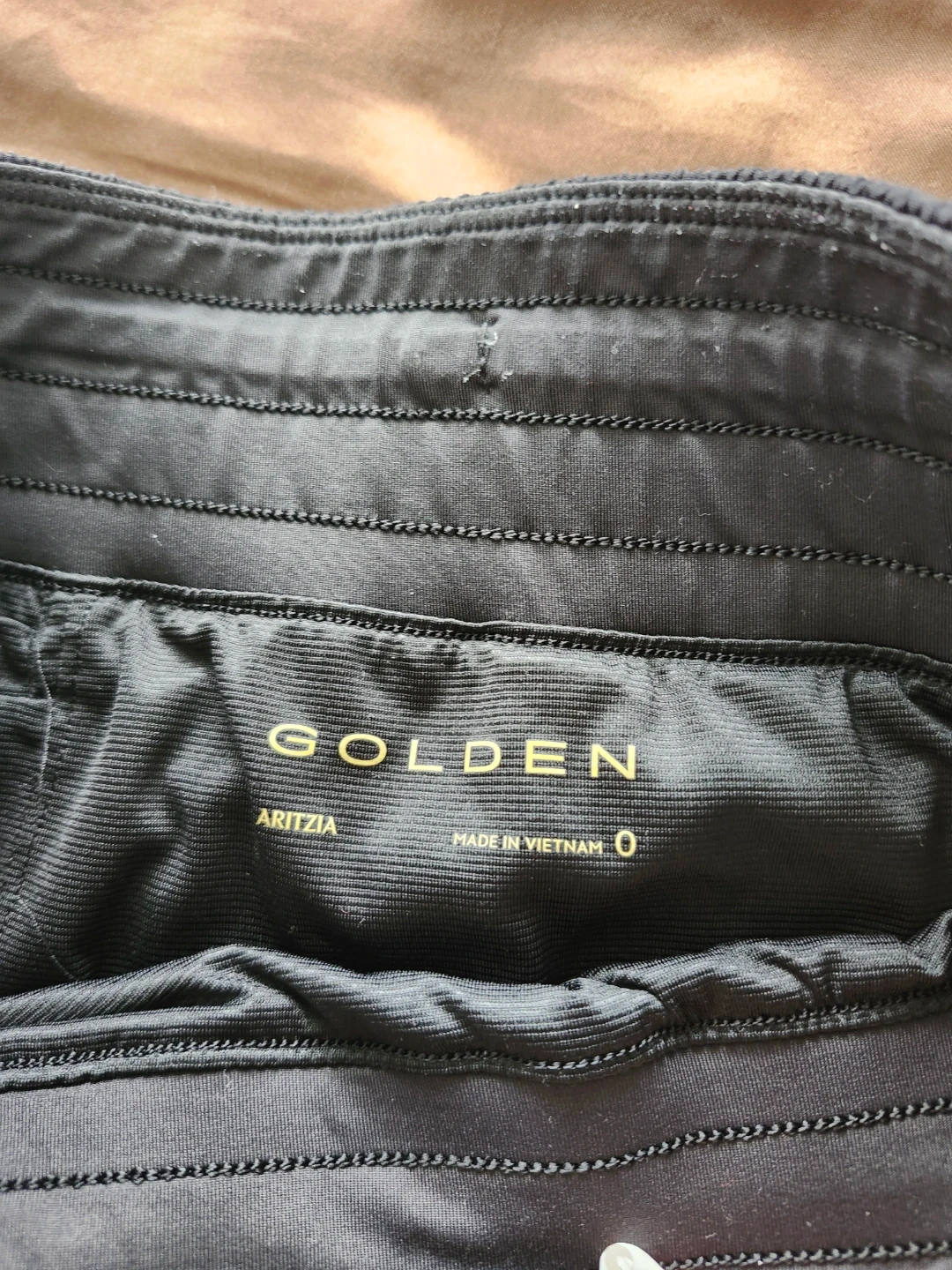 Black running shorts from Aritzia's Golden line. Size is 0. Made in Vietnam. Elastic waistband with a small zippered pocket on the right side.