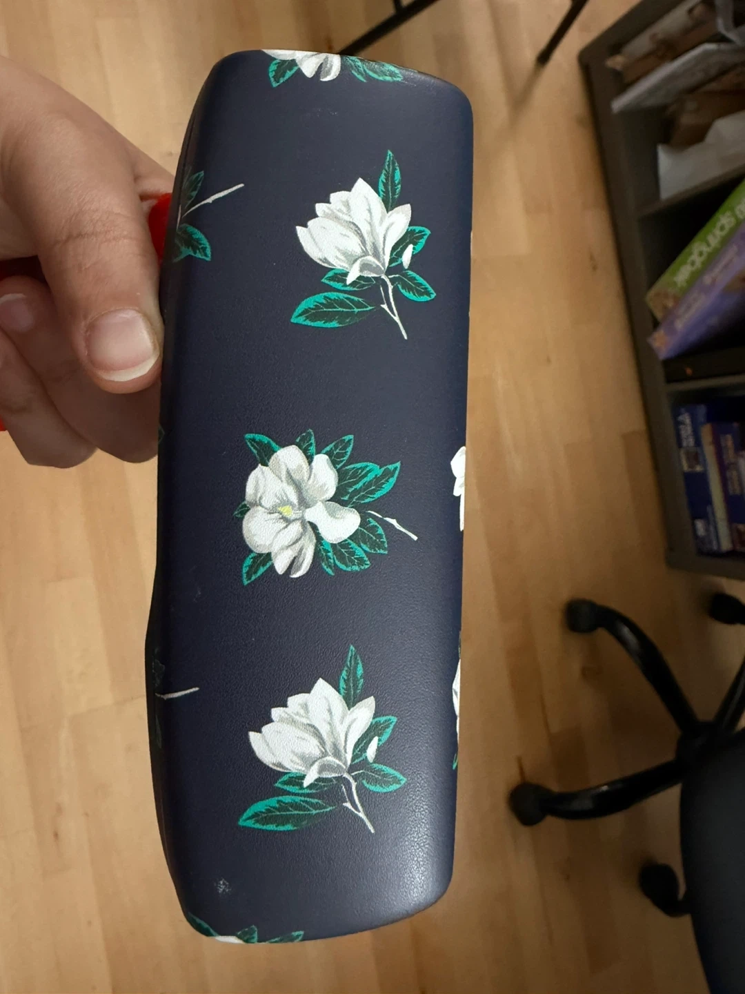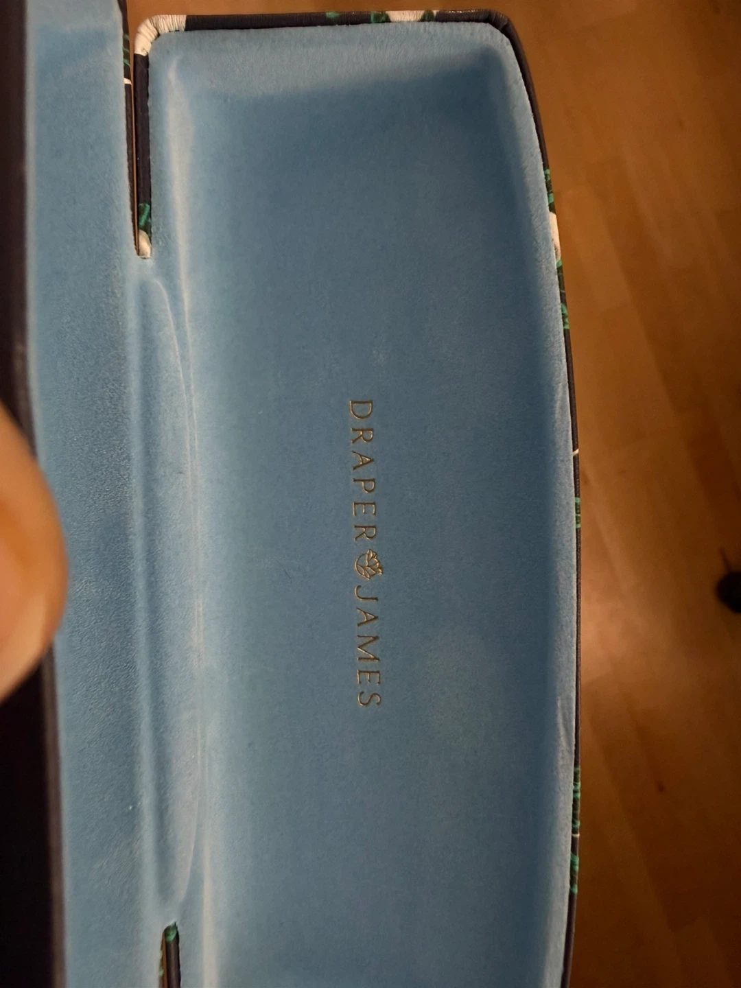 This is a navy blue hard-shell eyeglass case with a white floral print. The interior is lined with soft blue fabric and features the Draper James logo. It's perfect for protecting your glasses!
