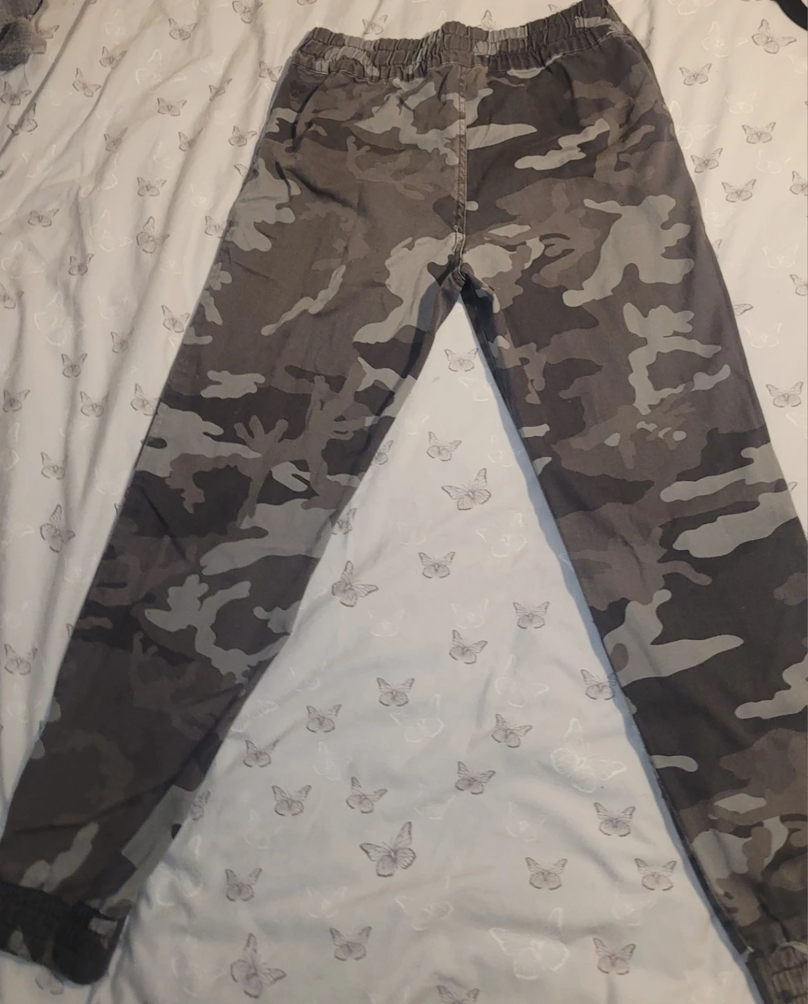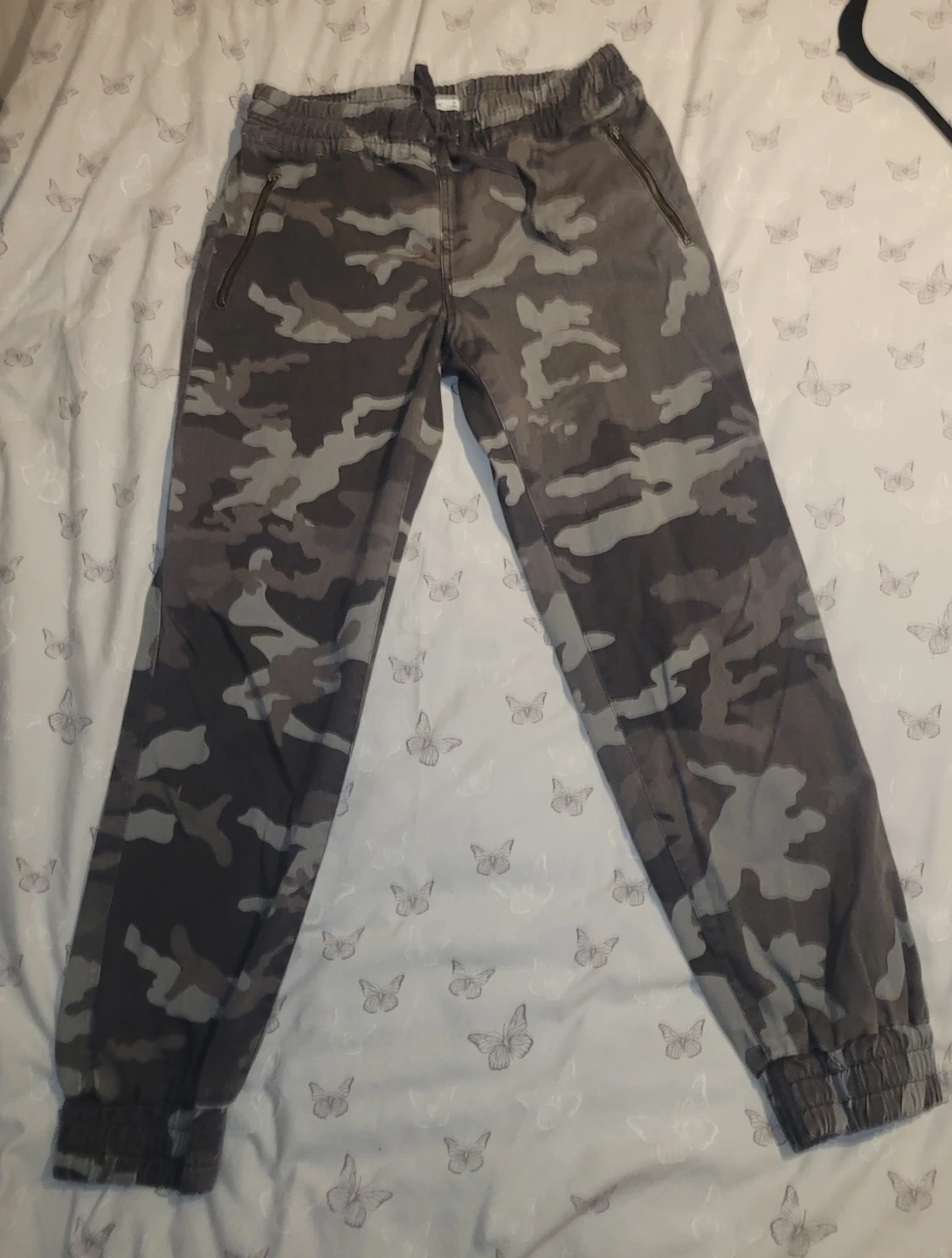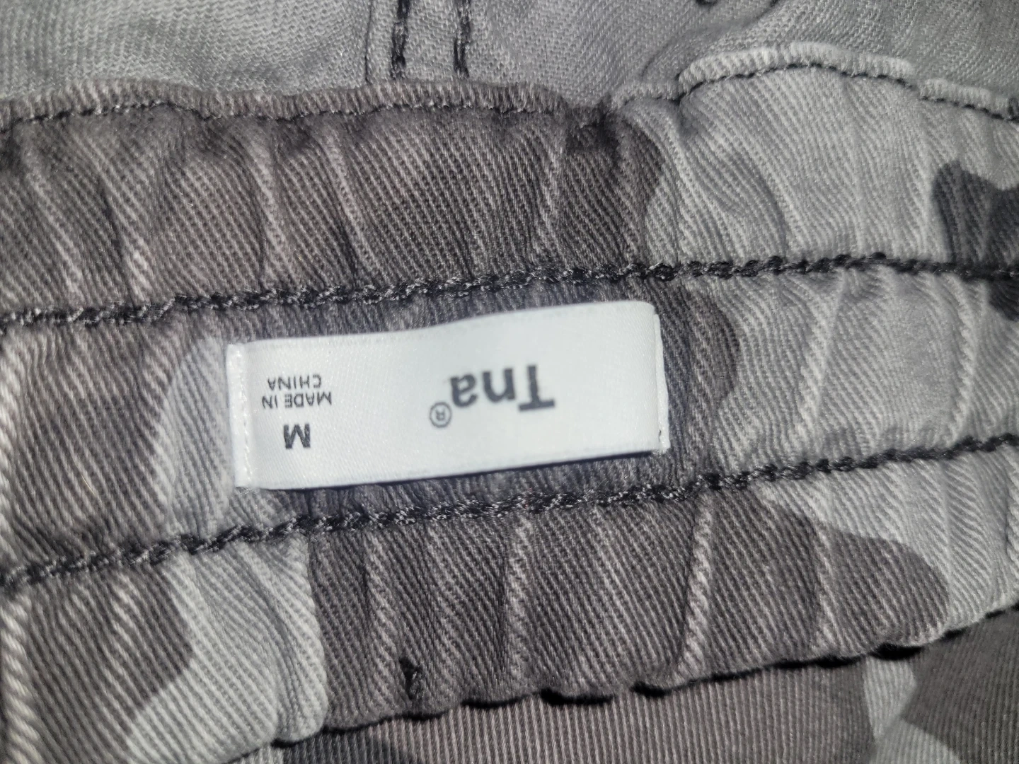These Tna cargo jogger pants feature a cool camouflage print. They have an elastic waistband with a drawstring and zippered pockets. Elastic cuffs keep them snug.