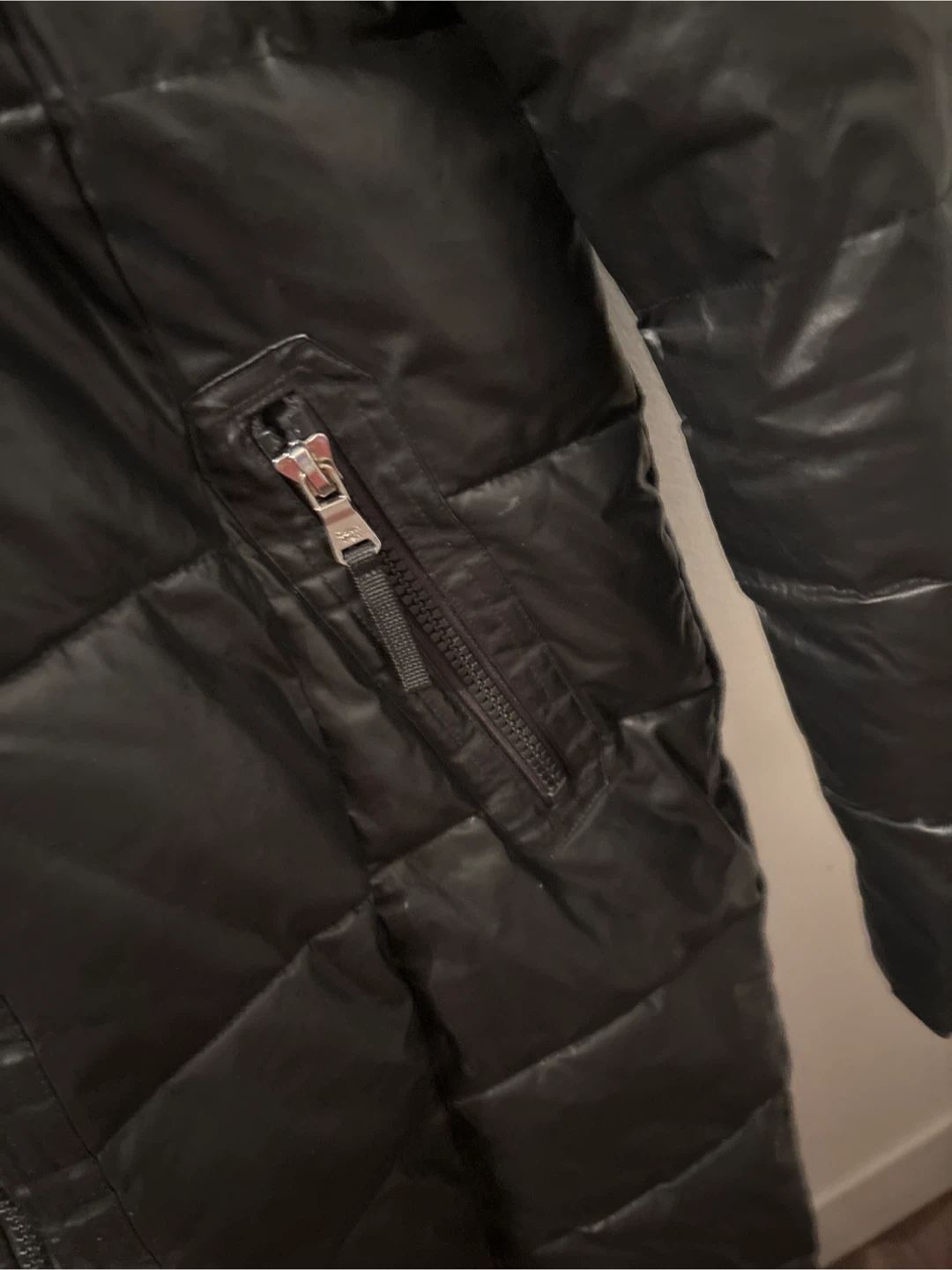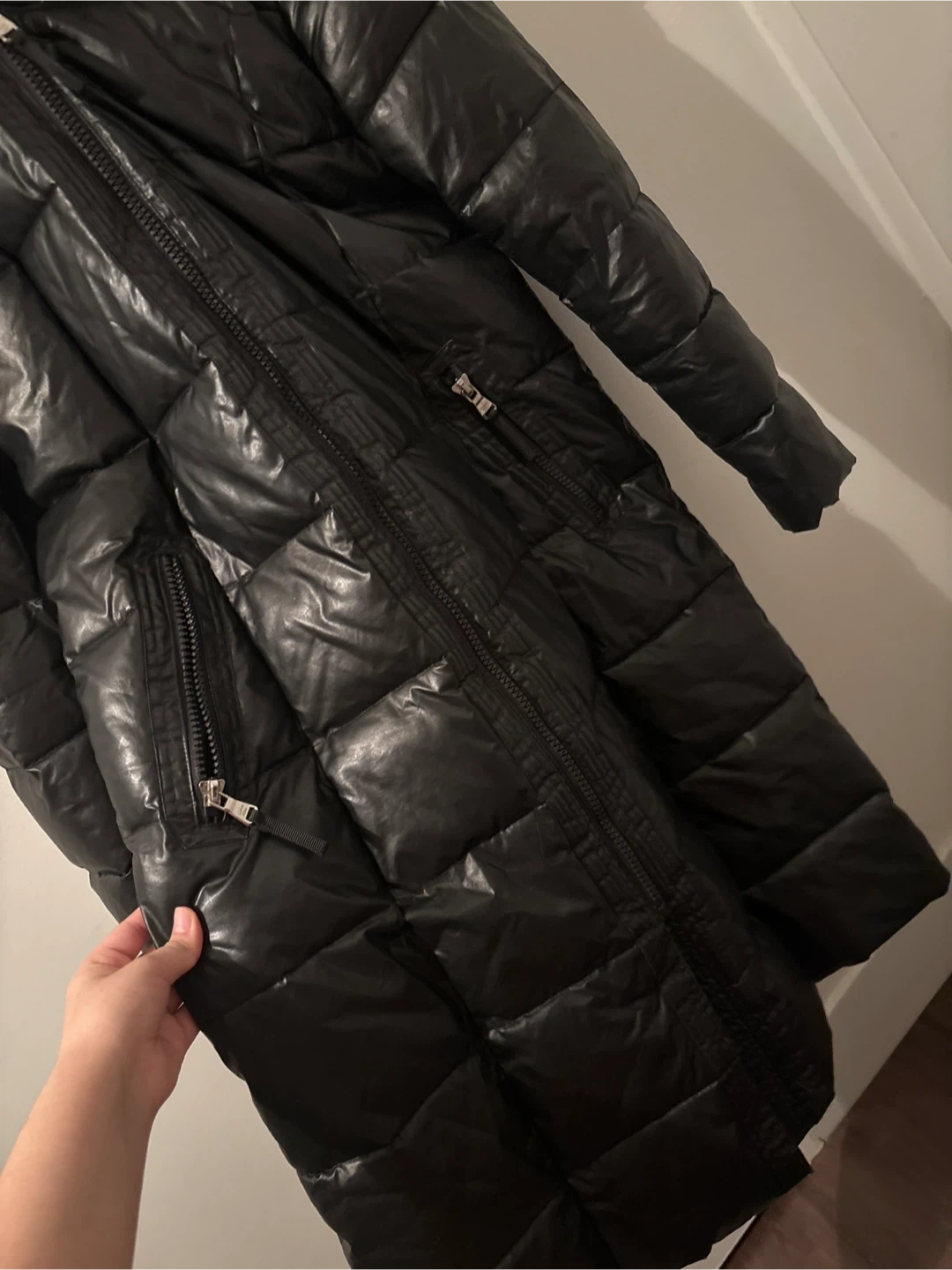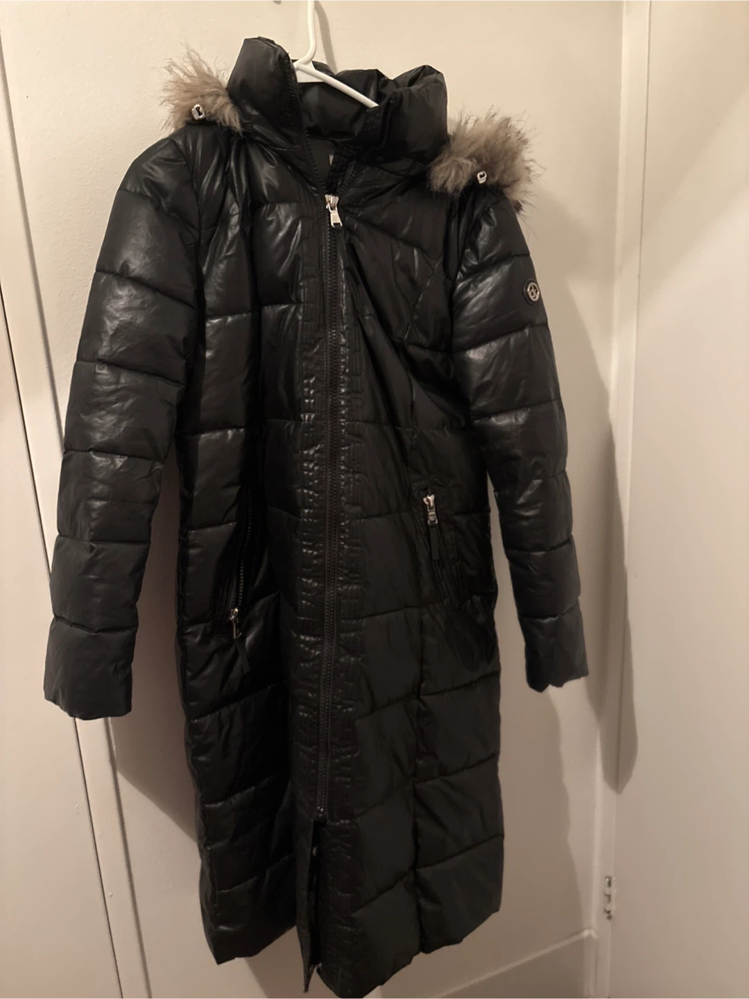 Black puffer coat with a faux fur-lined hood. It features a full zipper closure and multiple zippered pockets. The interior lining is a vibrant pink colour.