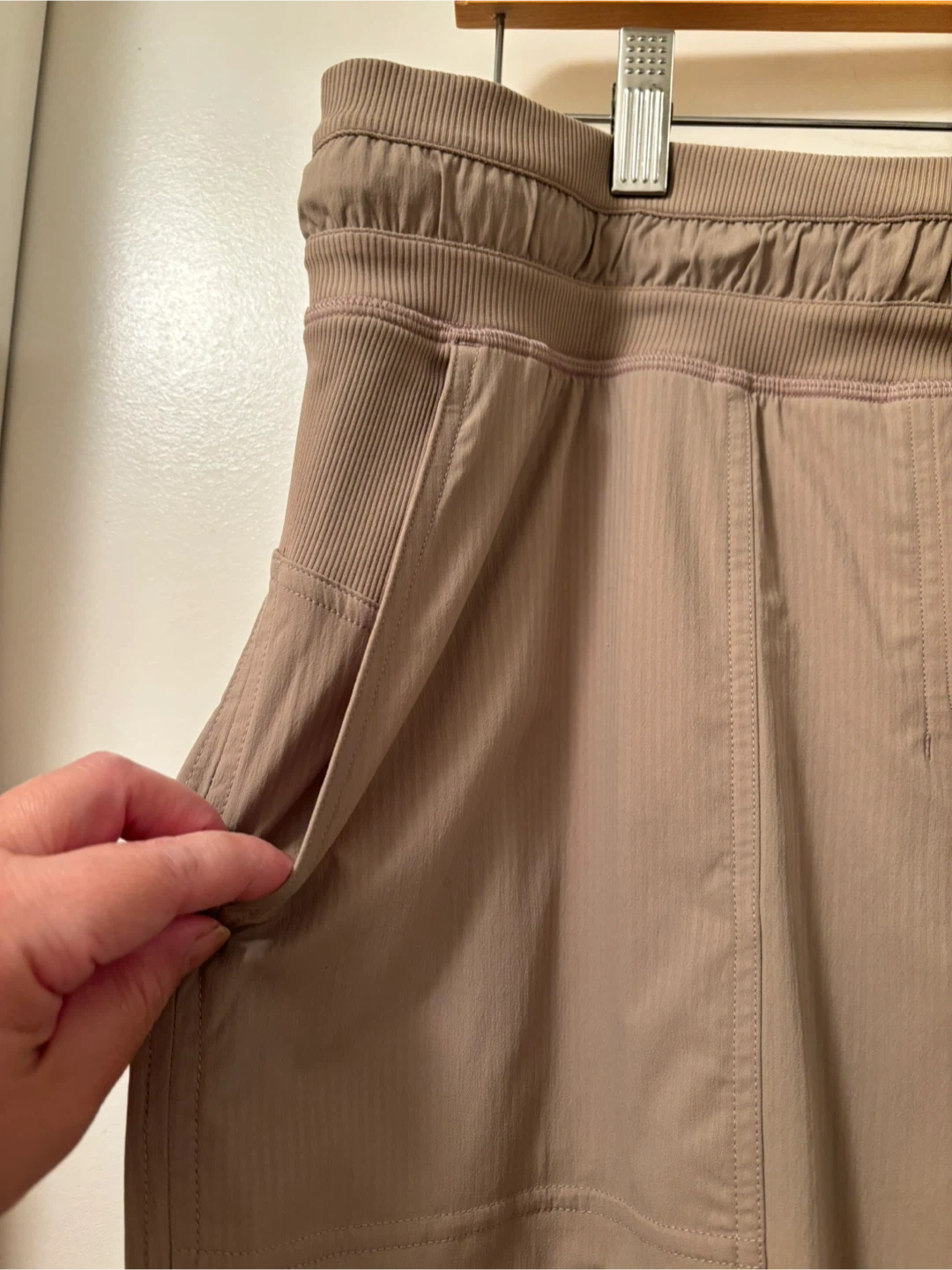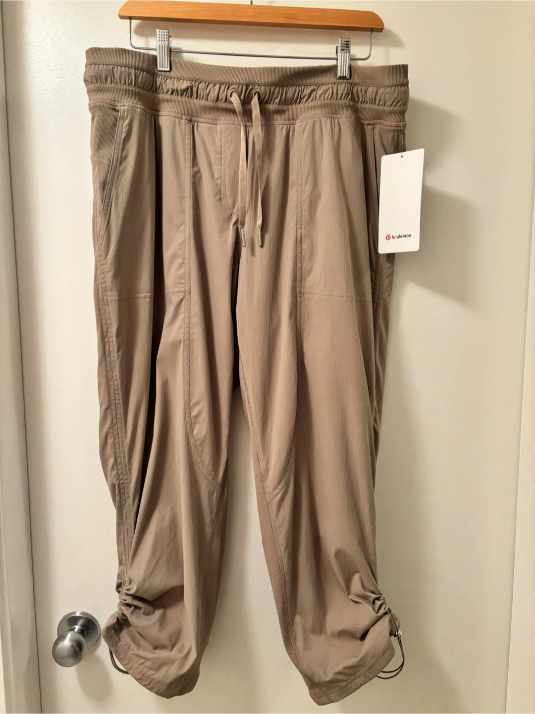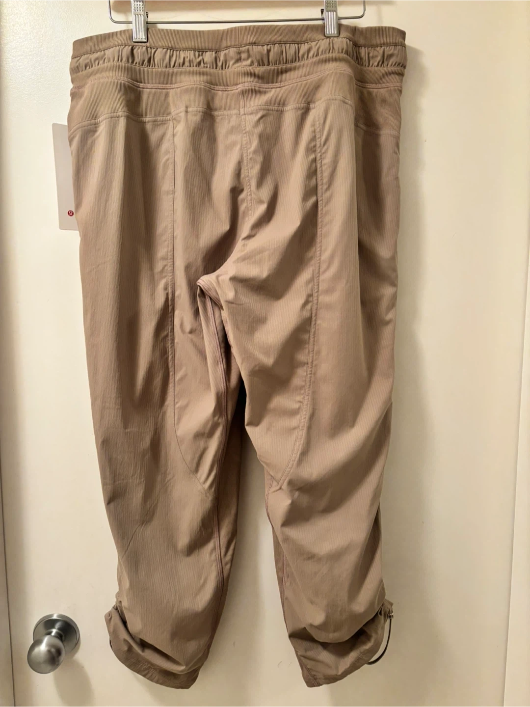 These Lululemon pants are made of a lightweight, textured fabric. They feature a drawstring waist and adjustable cinched cuffs. Great for casual wear or light activity! Original price $88 + tax.