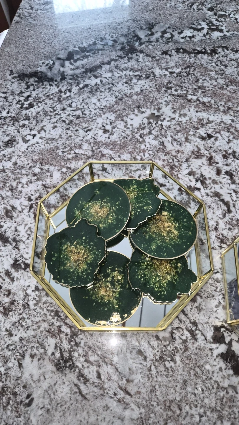 I'm selling a set of handmade resin coasters with lovely gold accents. They come in a beautiful tray, perfect for adding a touch of elegance to your coffee table or bar area. The coasters are a great way to protect your furniture from water rings while adding a decorative touch to your home!