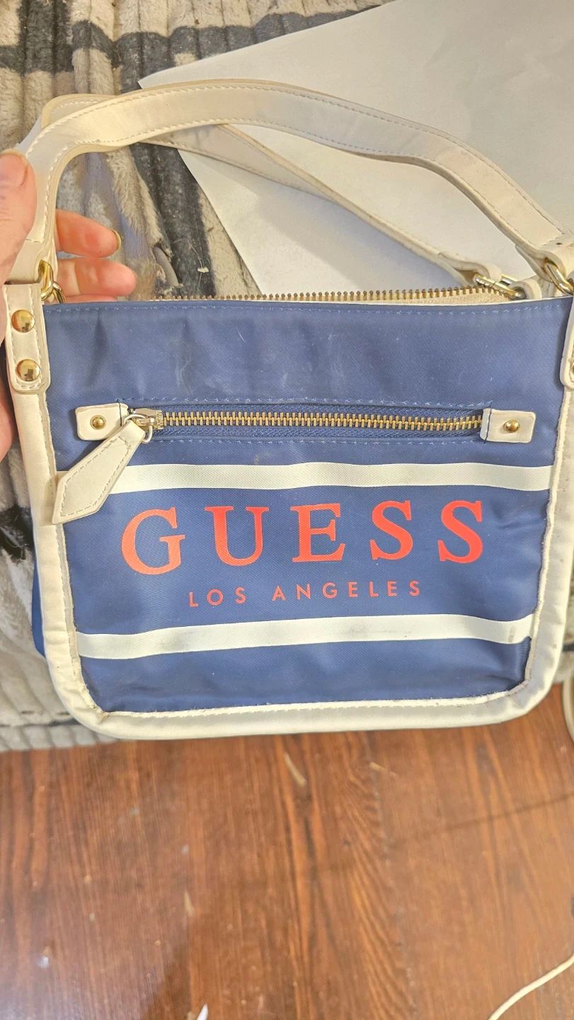 This Guess crossbody bag is navy blue with white trim and straps. It features the Guess logo prominently on the front. The interior has multiple compartments for organization.