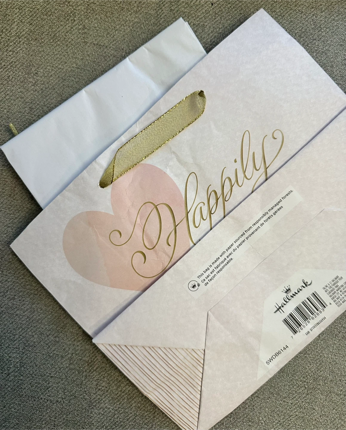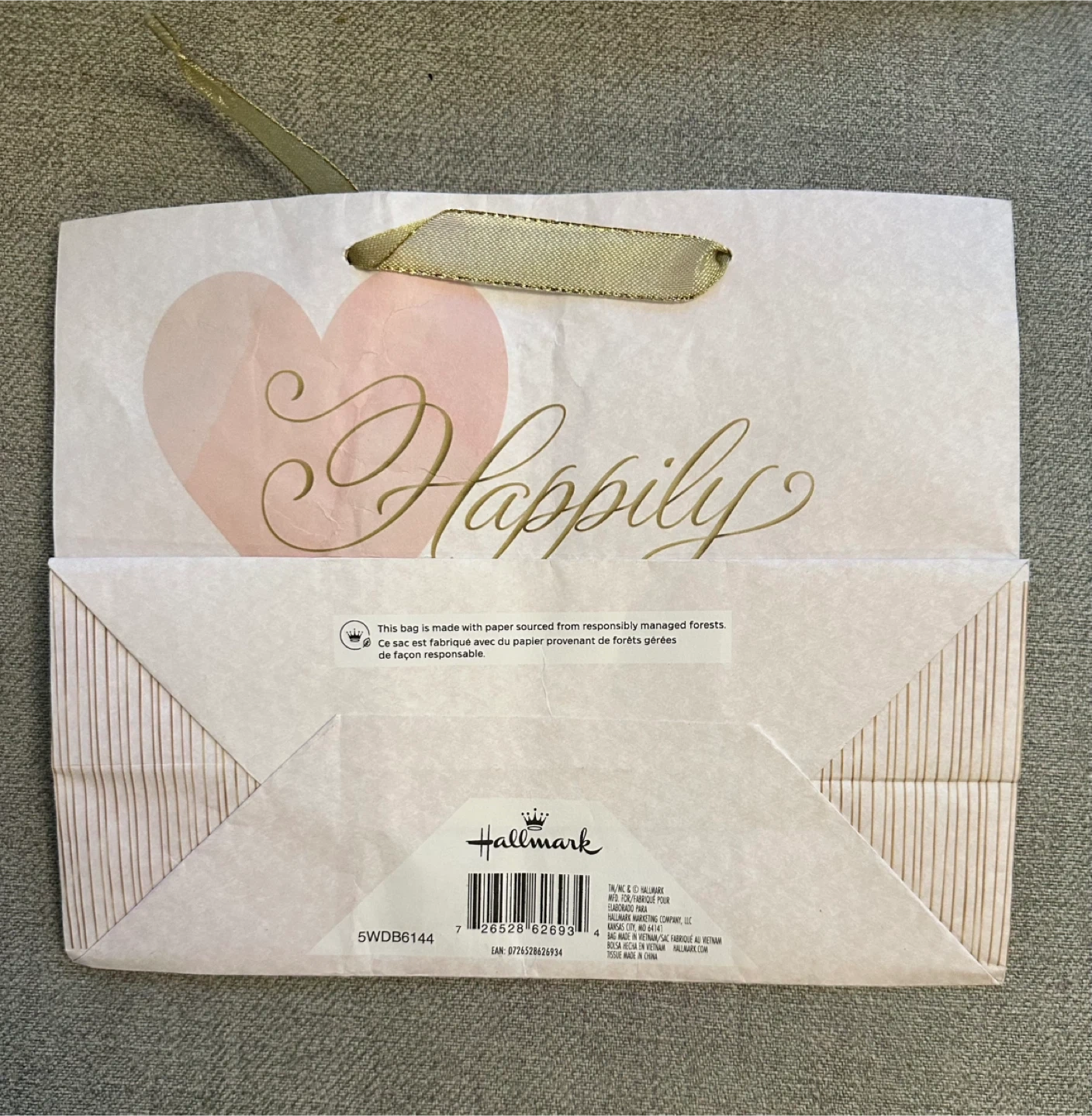 This Hallmark gift bag features a "Happily Ever After" design with pink hearts and gold lettering. It's made with paper sourced from responsibly managed forests. Includes a ribbon handle and tissue paper.