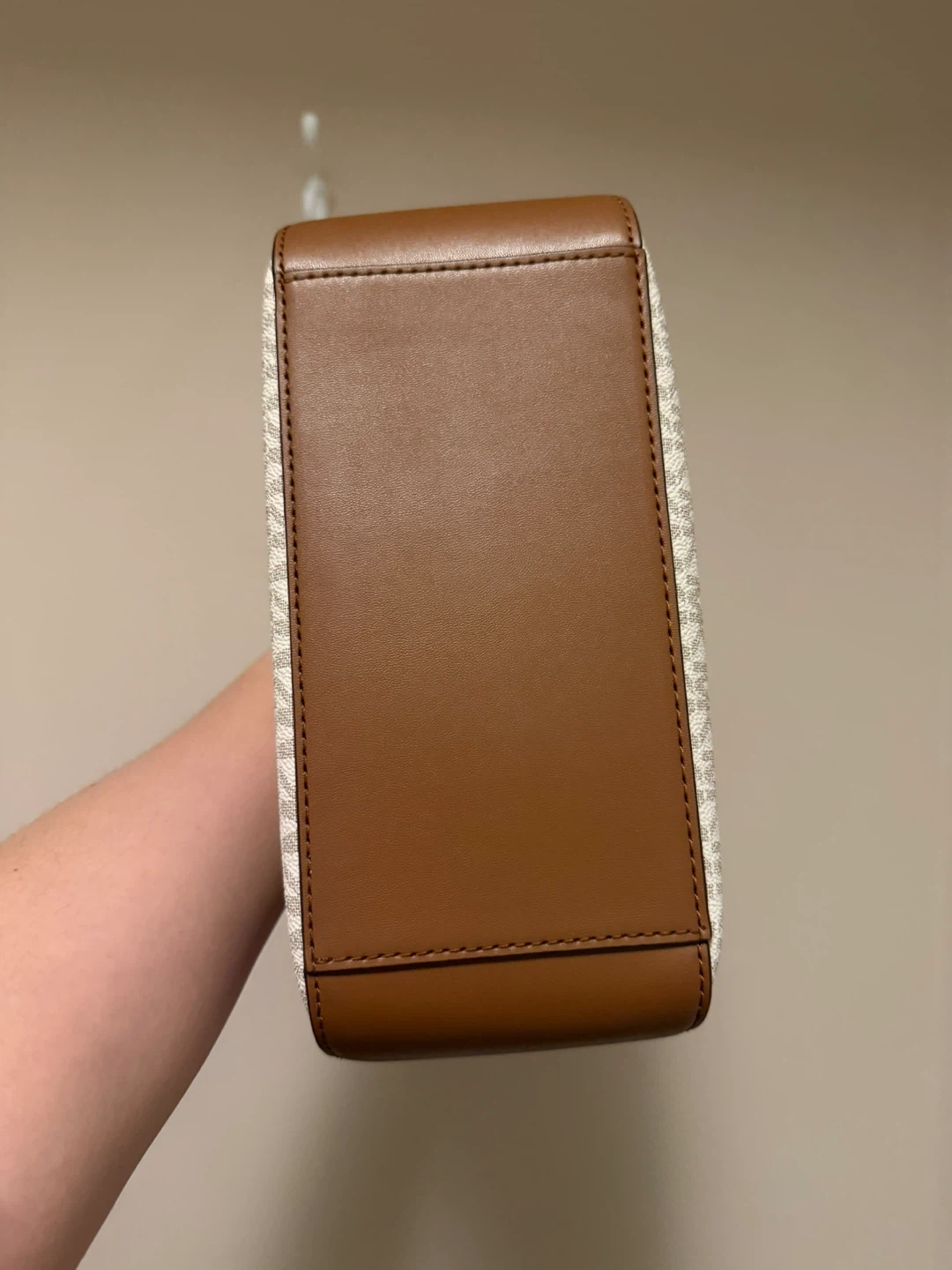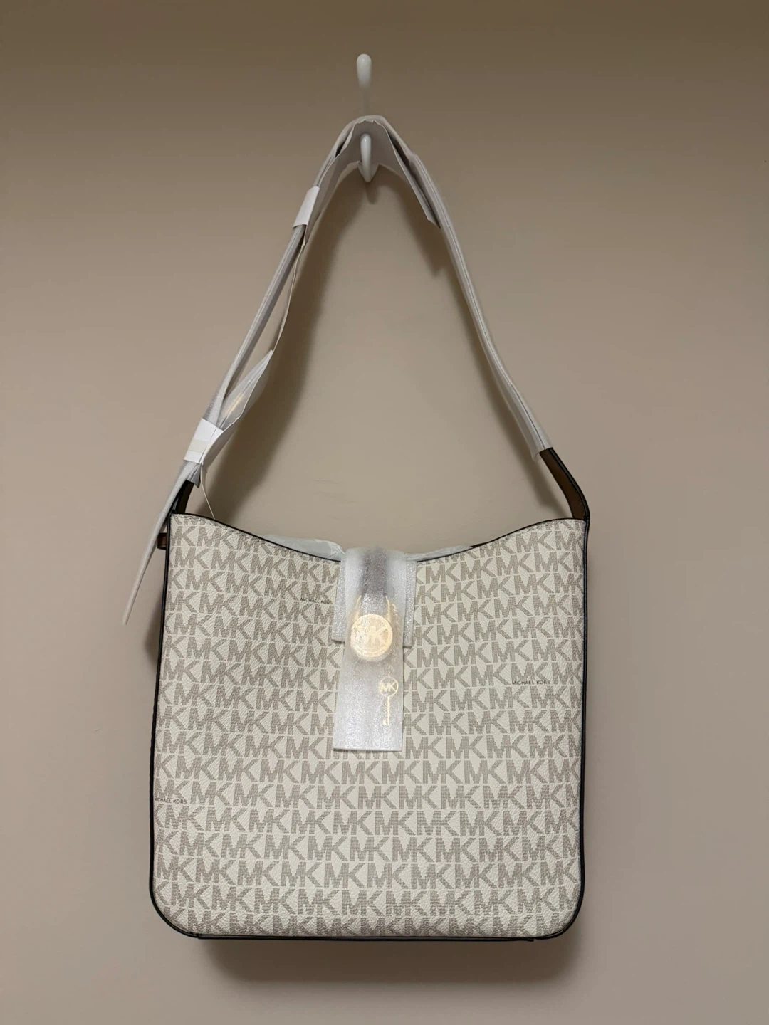 This is a brand new Michael Kors shoulder bag in Vanilla color. It features the signature MK logo pattern in beige and white with brown leather accents. This bag is perfect for everyday use!
