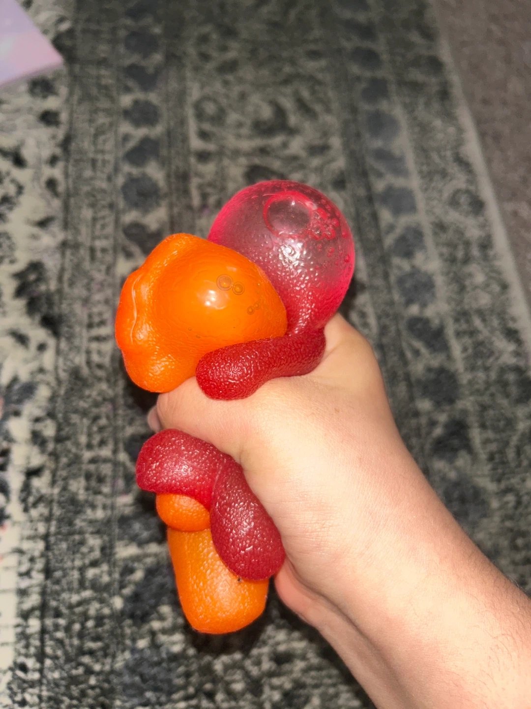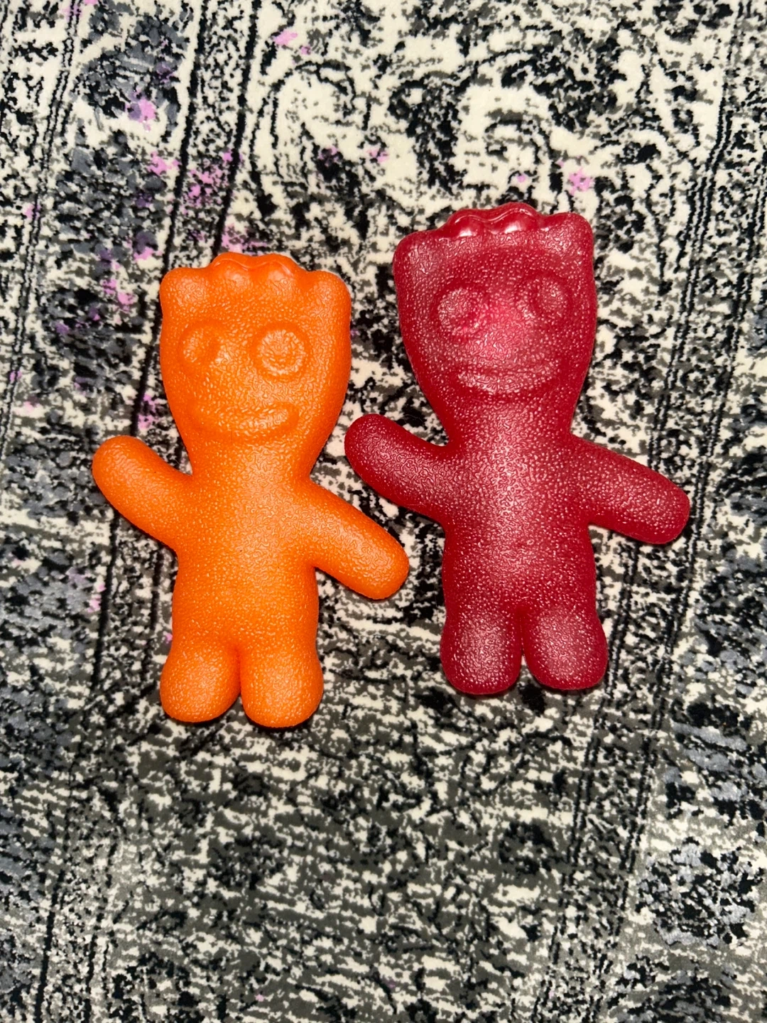 Two squishy toys shaped like Sour Patch Kids, one red and one orange. These are fun to squeeze and fidget with. They're great for stress relief or just for play!!!!!