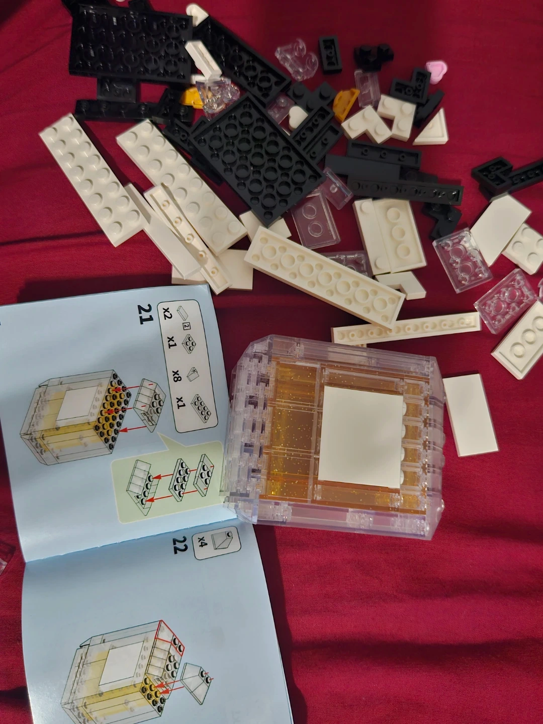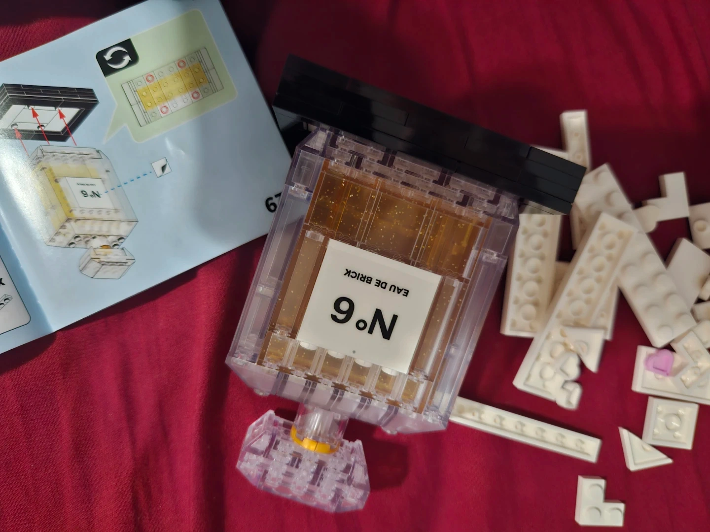 This is a set of building blocks that assemble into a clear perfume bottle with gold glitter inside. It's labelled "N°6 EAU DE BRICK". Instructions are included for assembly.