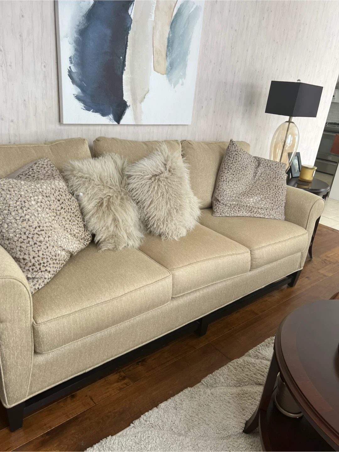 A comfortable three-seater sofa in a neutral beige fabric. This sofa would fit nicely in a living room or family room. No damage and no stains and is in excellent new condition. Cushions retain their shape no sagging. Fancy cushions not included. $600 FIRM